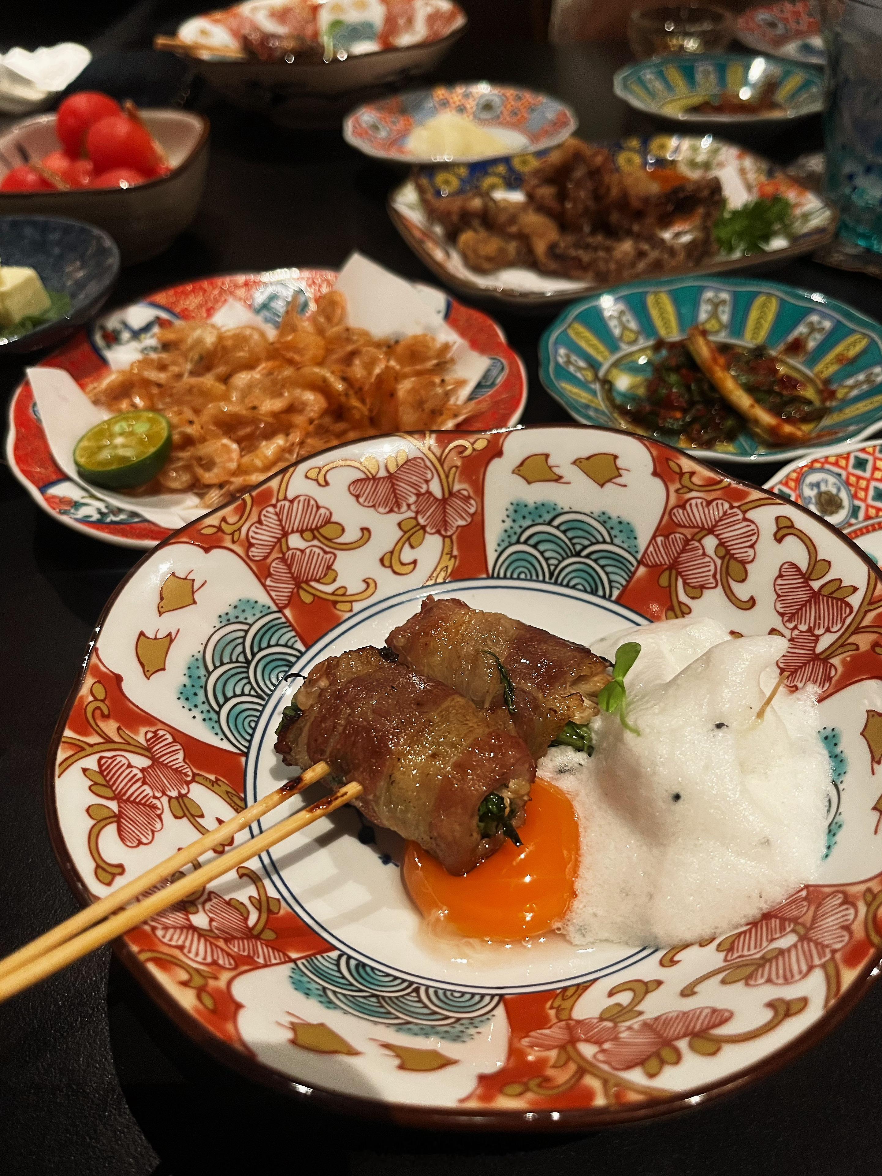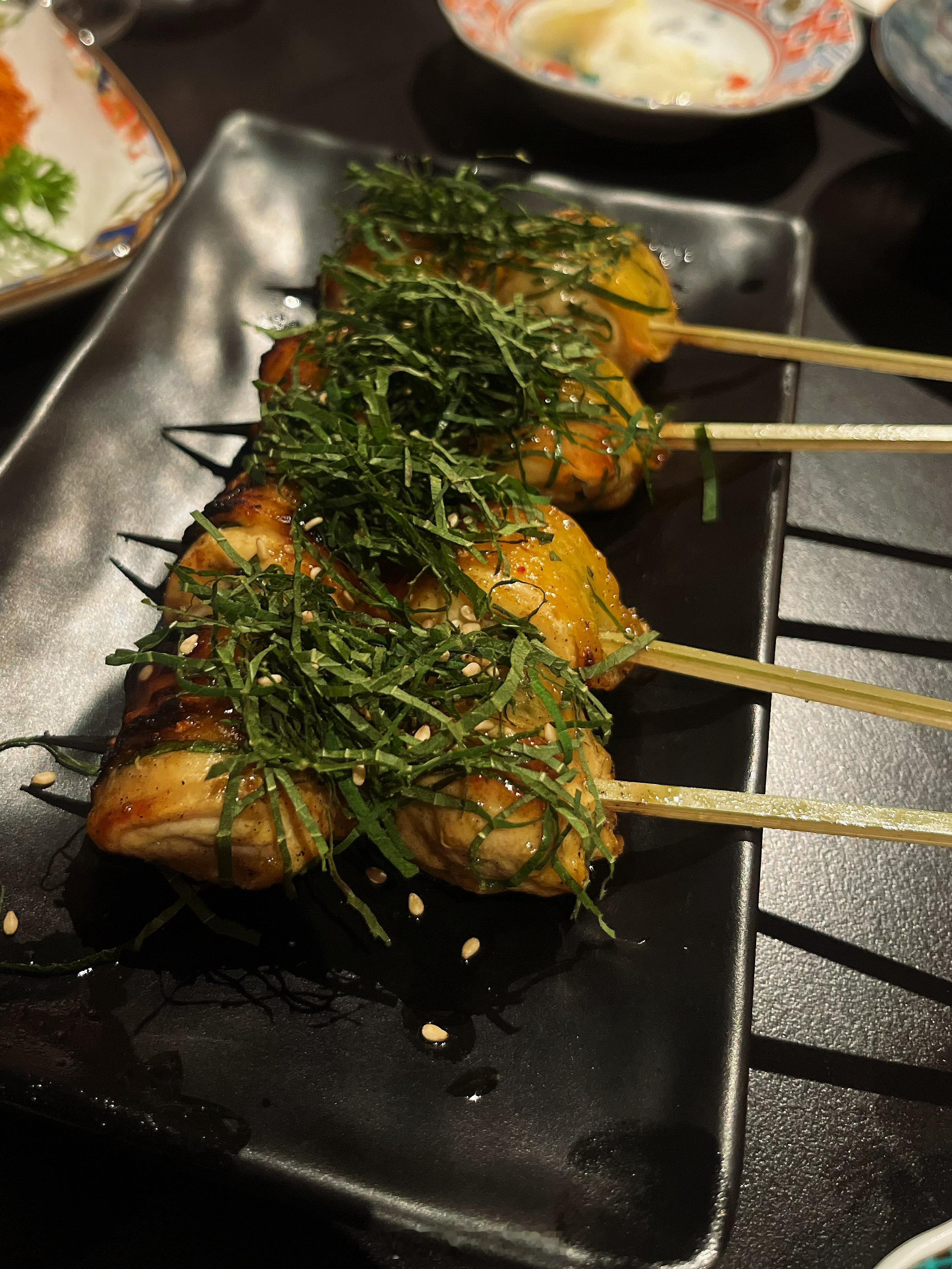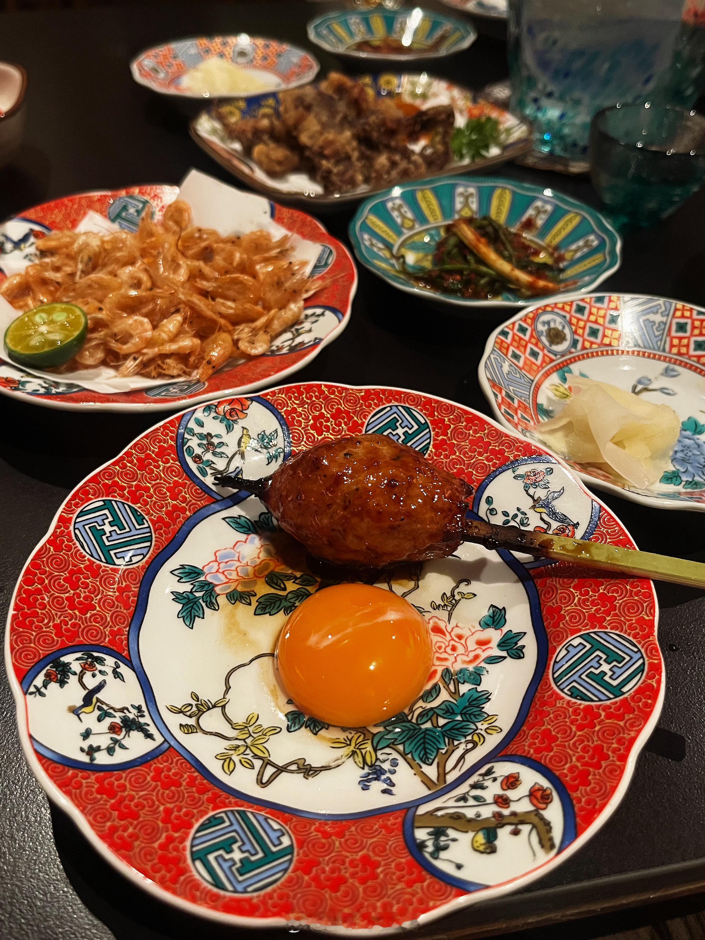 鸡肉棒配太阳之卵, 脆脆鸡皮包裹绵扎鸡肉,搭配爽滑无菌蛋汁,100分。