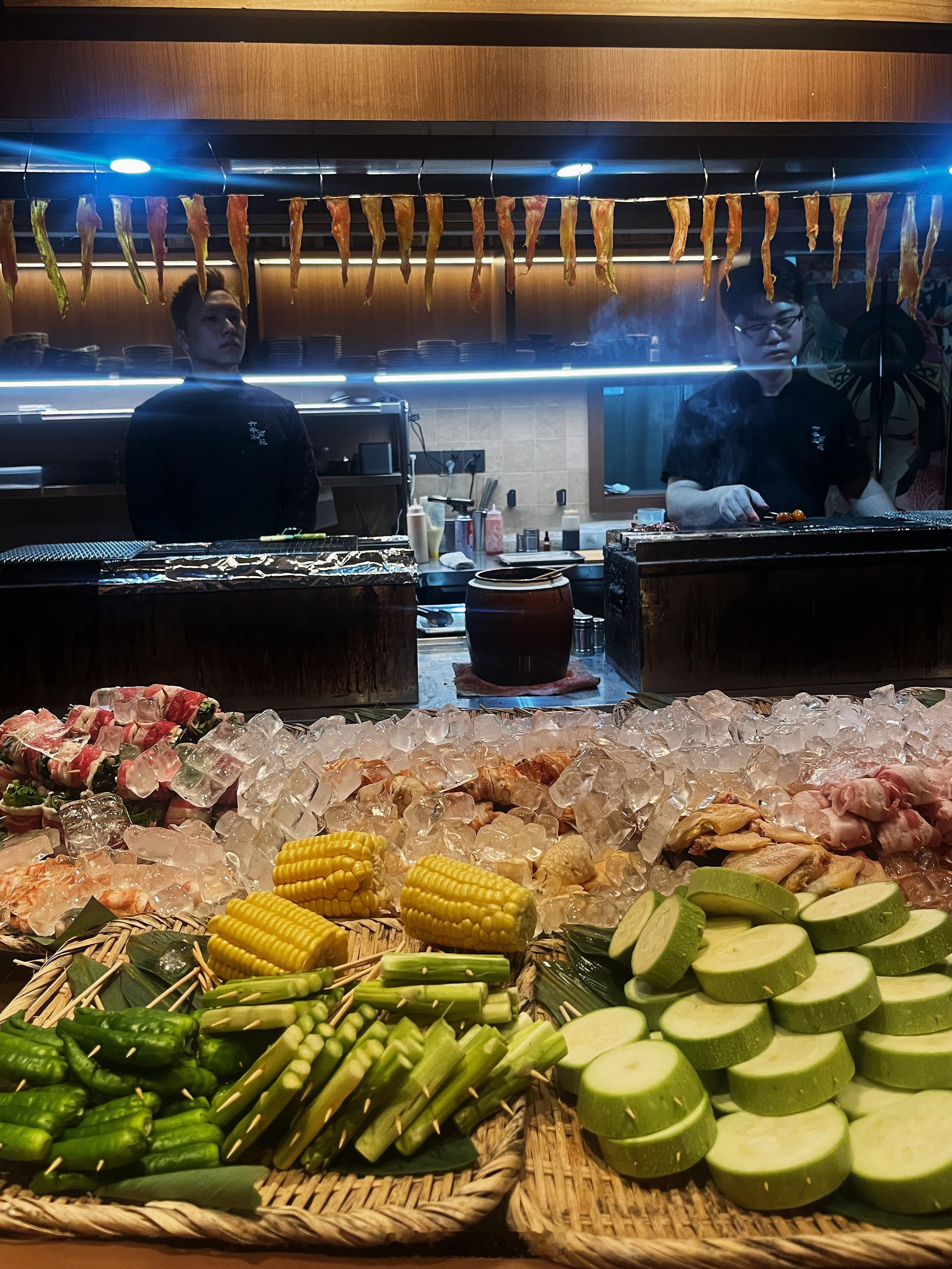 各种烧鸟蔬菜水果乡琳琅满目,看上啥点啥,现烤。