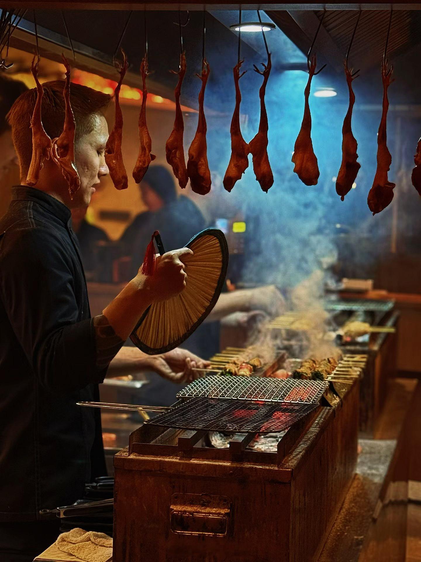 大厨在一堆堆食材后面腾云驾雾,备长碳高温锁住鸡肉汁水。