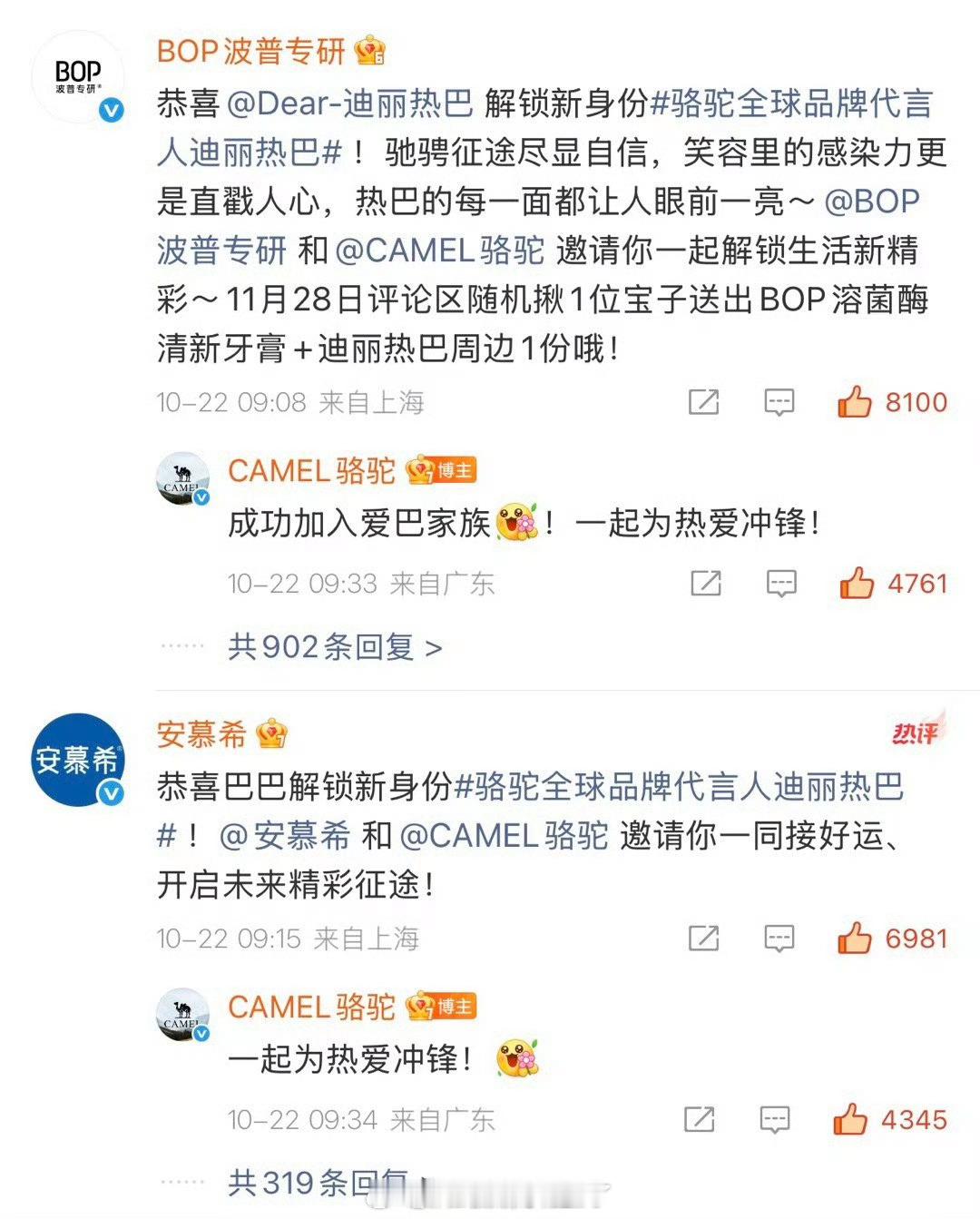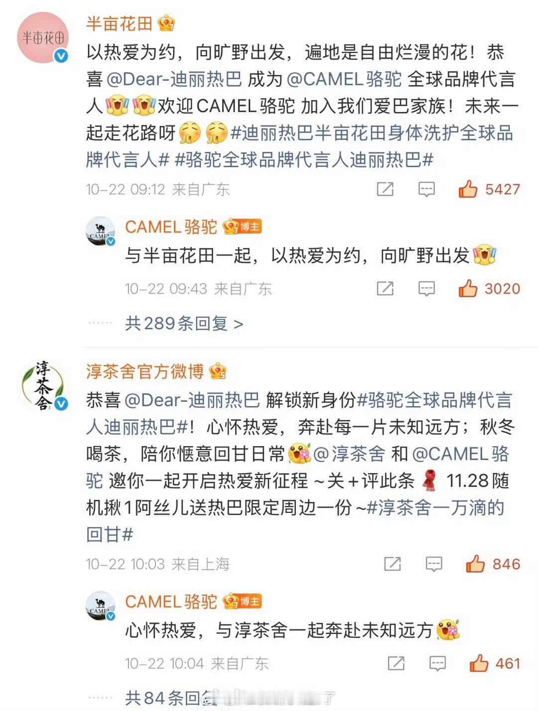 迪丽热巴代言的品牌又去骆驼官宣博团建了,热巴的代言氛围都好好哦,大家都好宠爱这个