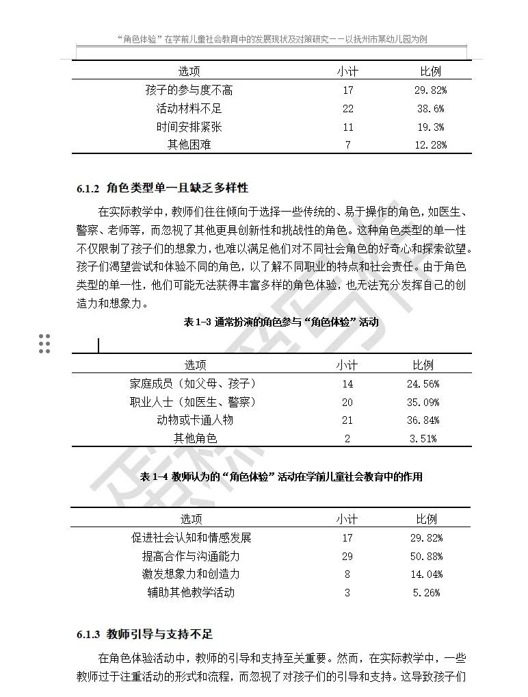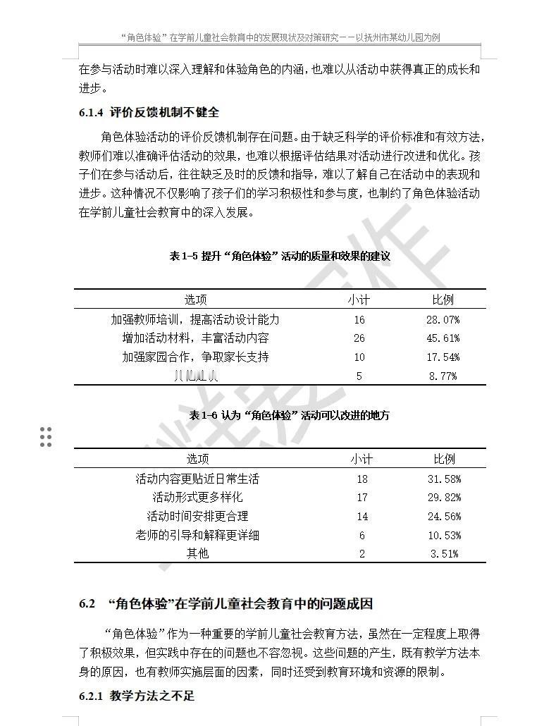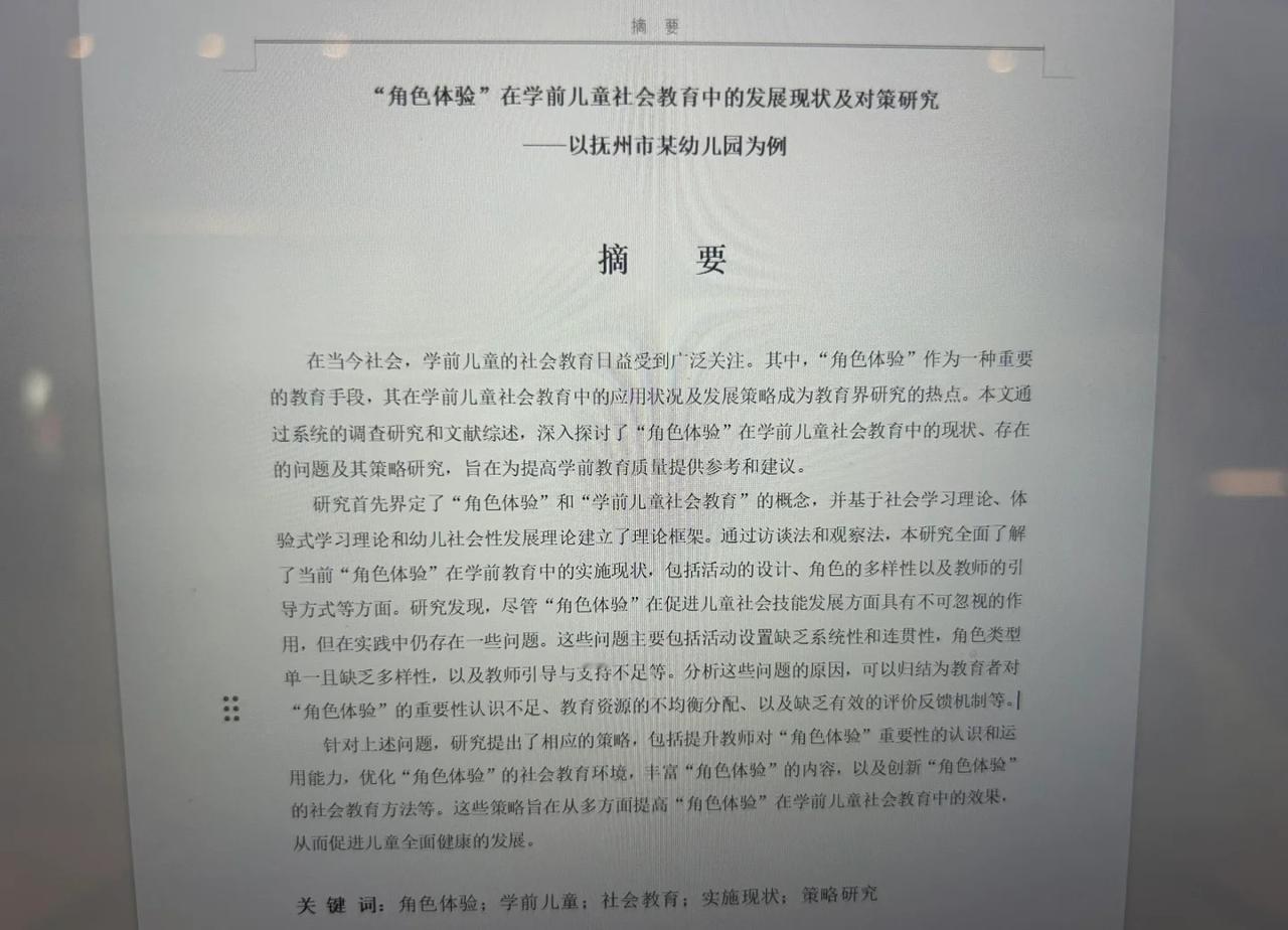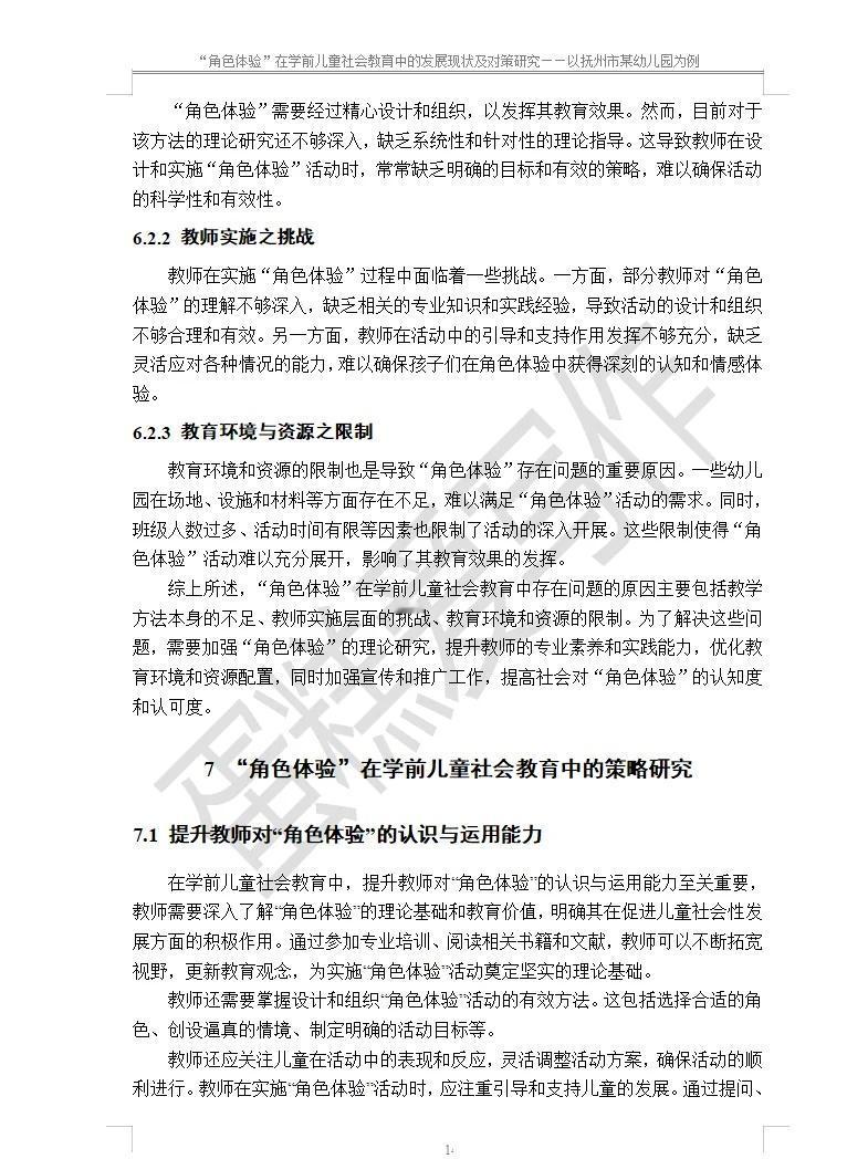 角色体验在学前儿童社会教育中的发展现状 浪漫生活的记录者 “角色体验”在学前儿童社会教育中的发展现状及对策研究 ——以抚州市某幼儿园为例 摘 要[] 在当今社会,学前儿童的社会教育日益受到广泛关注。其中,“角色体验”作为一种重要的教育手段,其在学前儿童社会教育中的应用状况及发展策略成为教育界研究的热点。本文通过系统的调查研究和文献综述,深入探讨了“角色体验”在学前儿童社会教育中的现状、存在的问题及其策略研究,旨在为提高学前教育质量提供参考和建议。 研究首先界定了“角色体验”和“学前儿童社会教育”的概念,并基于社会学习理论、体验式学习理论和幼儿社会性发展理论建立了理论框架。通过访谈法和观察法,本研究全面了解了当前“角色体验”在学前教育中的实施现状,包括活动的设计、角色的多样性以及教师的引导方式等方面。研究发现,尽管“角色体验”在促进儿童社会技能发展方面具有不可忽视的作用,但在实践中仍存在一些问题。这些问题主要包括活动设置缺乏系统性和连贯性,角色类型单一且缺乏多样性,以及教师引导与支持不足等。分析这些问题的原因,可以归结为教育者对“角色体验”的重要性认识不足、教育资源的不均衡分配、以及缺乏有效的评价反馈机制等。 针对上述问题,研究提出了相应的策略,包括提升教师对“角色体验”重要性的认识和运用能力,优化“角色体验”的社会教育环境,丰富“角色体验”的内容,以及创新“角色体验”的社会教育方法等。这些策略旨在从多方面提高“角色体验”在学前儿童社会教育中的效果,从而促进儿童全面健康的发展。 关 键 词:角色体验;学前儿童;社会教育;实施现状;策略研究 热点 教育教学论文 论文打卡 论文写作 论文 带你一起读论文 学前教育论文 幼教分享