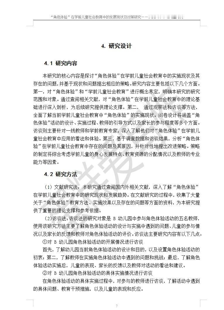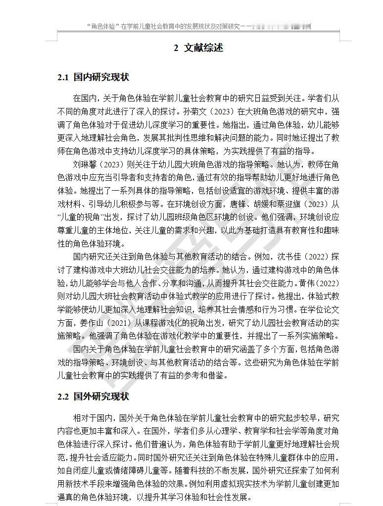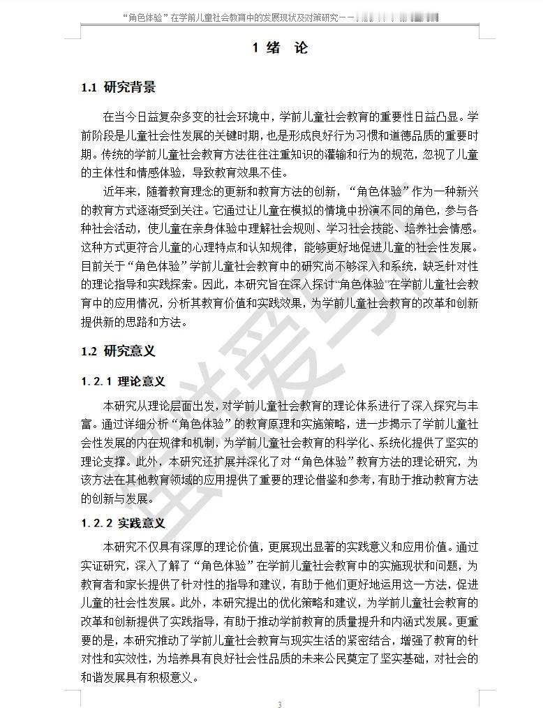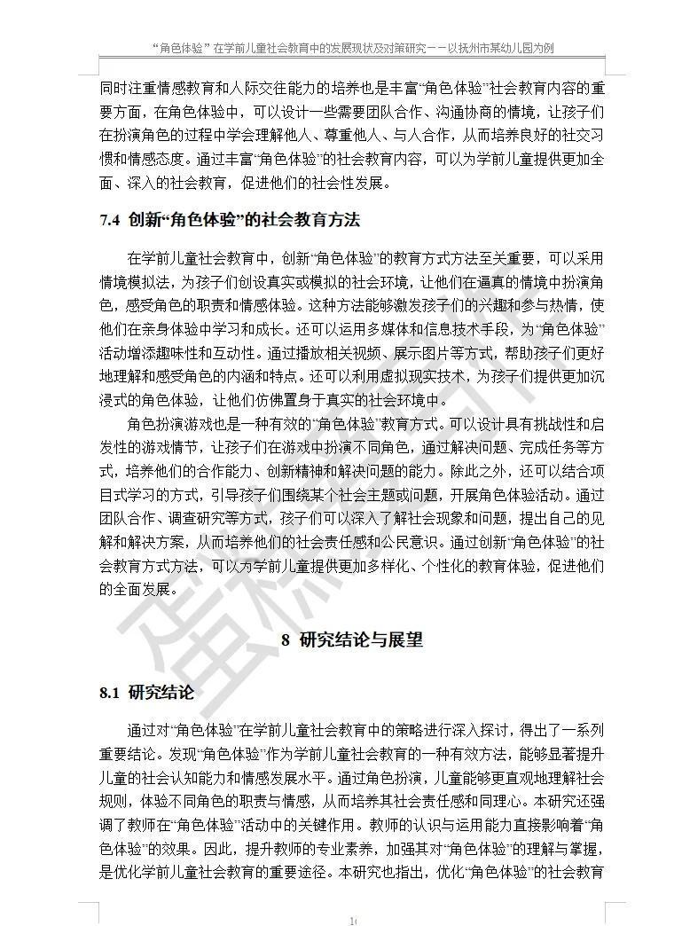 角色体验在学前儿童社会教育中的发展现状 浪漫生活的记录者 “角色体验”在学前儿童社会教育中的发展现状及对策研究 ——以抚州市某幼儿园为例 摘 要[] 在当今社会,学前儿童的社会教育日益受到广泛关注。其中,“角色体验”作为一种重要的教育手段,其在学前儿童社会教育中的应用状况及发展策略成为教育界研究的热点。本文通过系统的调查研究和文献综述,深入探讨了“角色体验”在学前儿童社会教育中的现状、存在的问题及其策略研究,旨在为提高学前教育质量提供参考和建议。 研究首先界定了“角色体验”和“学前儿童社会教育”的概念,并基于社会学习理论、体验式学习理论和幼儿社会性发展理论建立了理论框架。通过访谈法和观察法,本研究全面了解了当前“角色体验”在学前教育中的实施现状,包括活动的设计、角色的多样性以及教师的引导方式等方面。研究发现,尽管“角色体验”在促进儿童社会技能发展方面具有不可忽视的作用,但在实践中仍存在一些问题。这些问题主要包括活动设置缺乏系统性和连贯性,角色类型单一且缺乏多样性,以及教师引导与支持不足等。分析这些问题的原因,可以归结为教育者对“角色体验”的重要性认识不足、教育资源的不均衡分配、以及缺乏有效的评价反馈机制等。 针对上述问题,研究提出了相应的策略,包括提升教师对“角色体验”重要性的认识和运用能力,优化“角色体验”的社会教育环境,丰富“角色体验”的内容,以及创新“角色体验”的社会教育方法等。这些策略旨在从多方面提高“角色体验”在学前儿童社会教育中的效果,从而促进儿童全面健康的发展。 关 键 词:角色体验;学前儿童;社会教育;实施现状;策略研究 热点 教育教学论文 论文打卡 论文写作 论文 带你一起读论文 学前教育论文 幼教分享