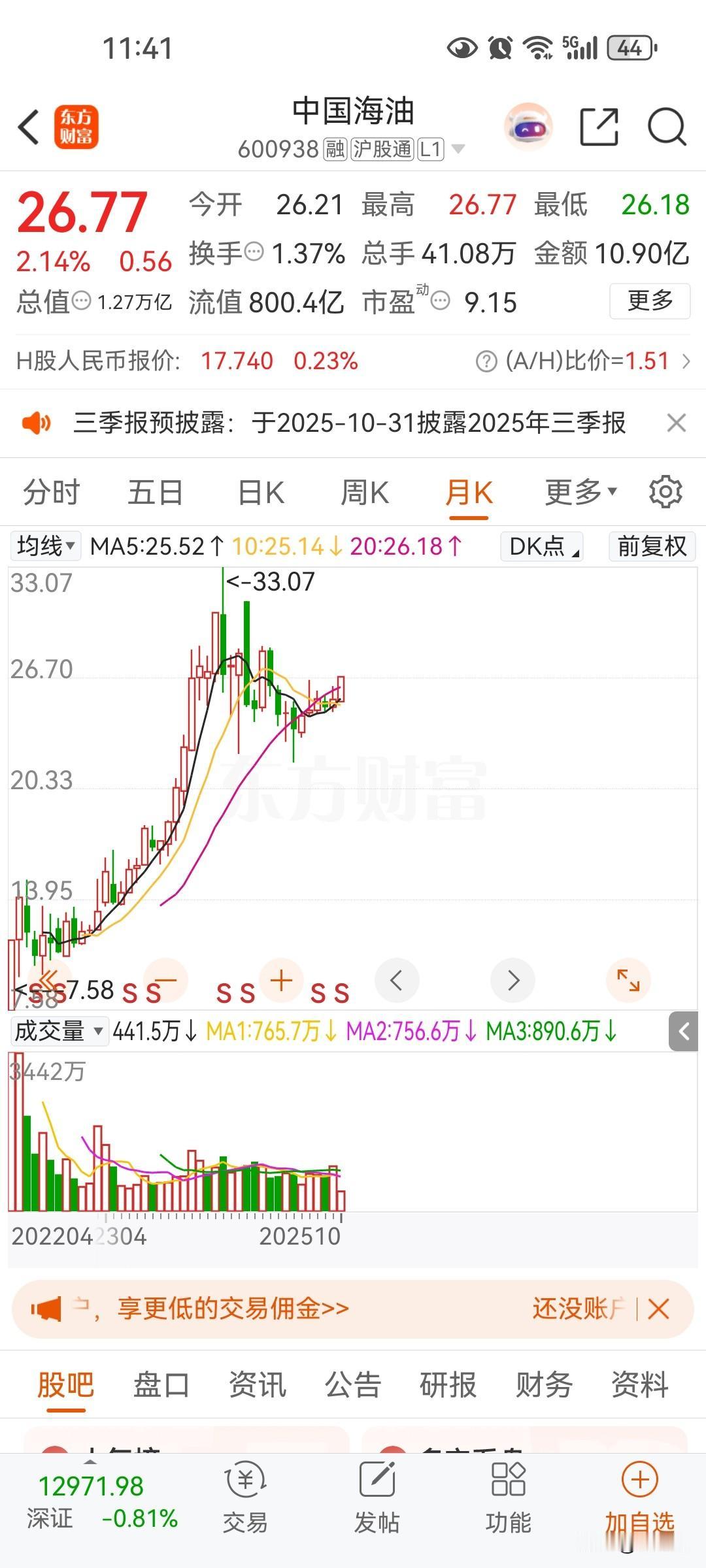 油价开始反弹中国海油开启上涨之路,百分之五十的毛利,十倍的市盈率肯定是低估的,最好是买港股便宜一半