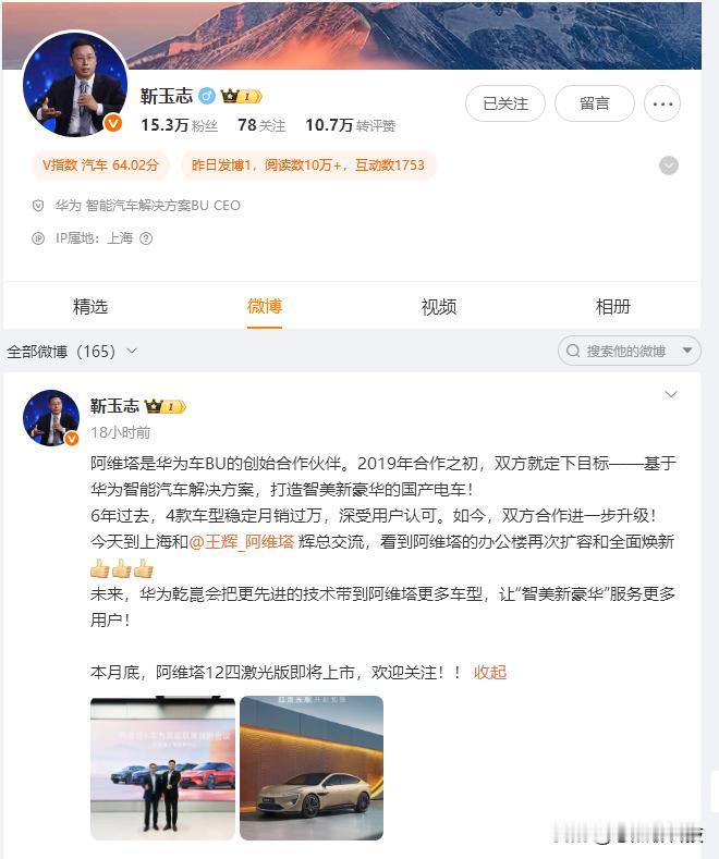 都说汽车市场很卷,竞争激烈,但我从华为乾崑和阿维塔身上看到了中国汽车产业未来发展的雏形。 华为智能汽车解决方案BU CEO靳玉志首访阿维塔上海新办公楼,双方展开了热烈的讨论和探讨。从2019年到现在,华为乾崑和阿维塔的合作在广度和深度上不断拓展。从一开始智能驾驶、智能座舱,到现在智能工厂、鸿蒙生态、用户运营及供应链体系,这种独特的“联合生态”,已经不是普通供应商,而是生态链上的相互促进、共同进步的深度合作关系。 其实一开始很多人并不看好,到六年四款精品车型和稳定的“月销过万”的销量,阿维塔“原创设计美学+大厂品质”与华为乾崑的智能化技术,形成了强大的竞争力。 站在双方战略合作2.0的节点上,华为车BU CEO靳玉志的到访预示着更紧密而深入合作的可能。正如他在微博中透露的,华为乾崑会把更先进的技术带到阿维塔更多车型。意味着双方合作不再局限于技术层面,而是全生命周期的技术陪伴和生态共建,打造出更多智能新豪华精品国产车。 总之,华为乾崑未来会将强大技术实力覆盖到阿维塔更多车型,与合作伙伴一起努力,助力中国智能汽车领先全球,这是非常肯定的事!华为乾崑