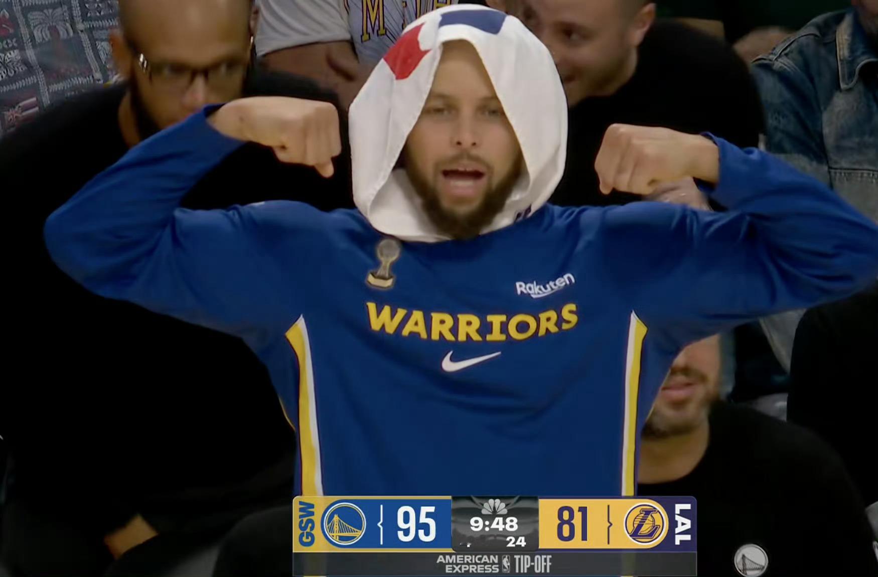 勇士场上大比分领先,库里场下庆祝秀肌肉💪勇士vs湖人