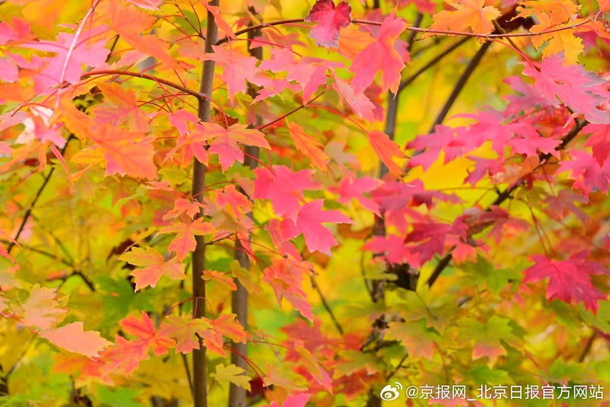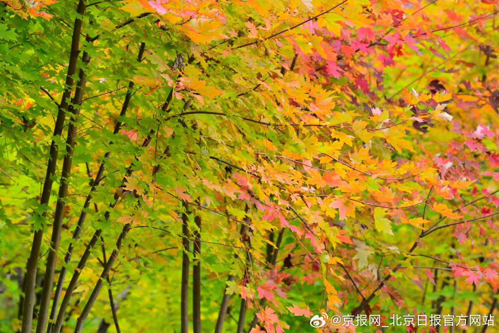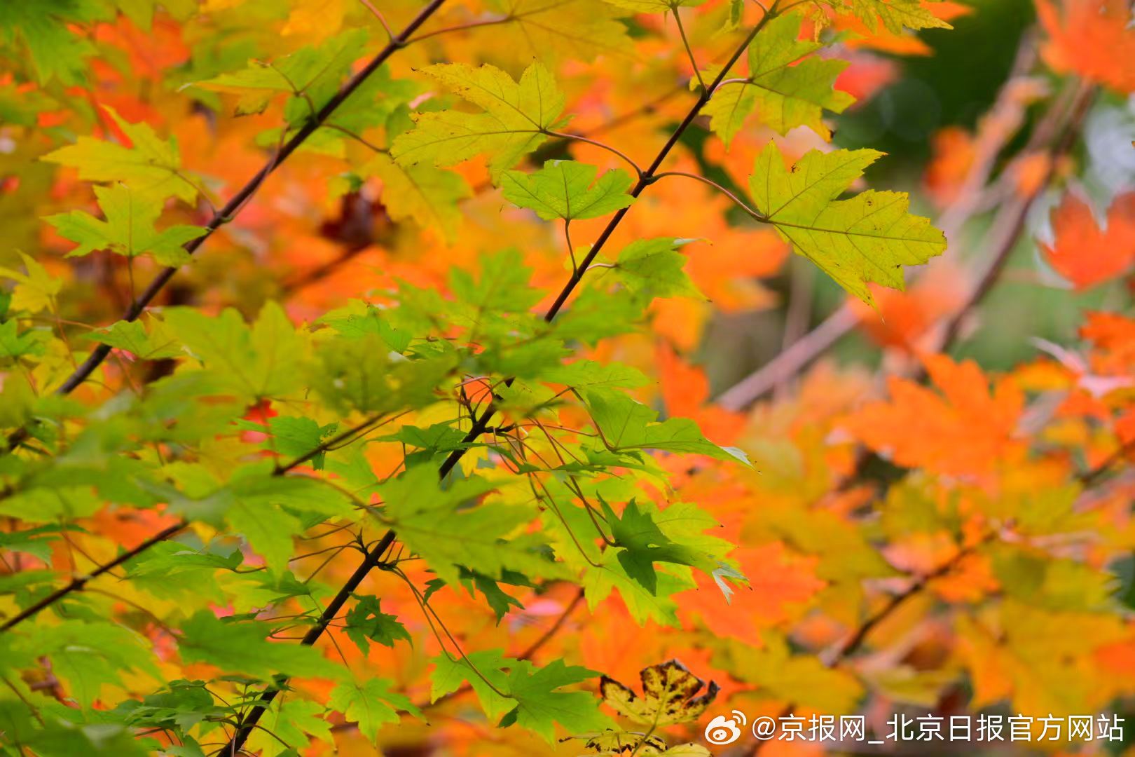 【斑斓!#北京已经层林尽染了#】#北京秋景像幅动态油画# 北京的秋,把山林变成了巨型调色盘!枫叶红得热烈、橙得明媚,还有黄绿交织的过渡色,层层叠叠晕染开,仿佛一幅动态油画。(作者 白雪亮)