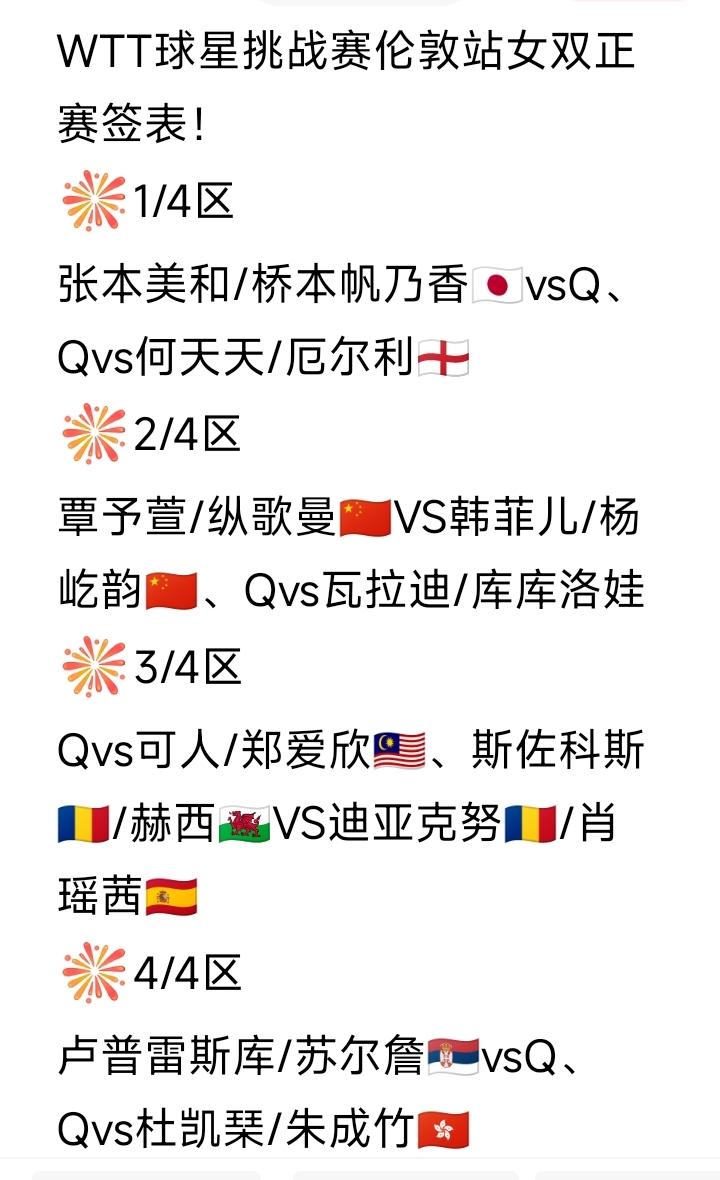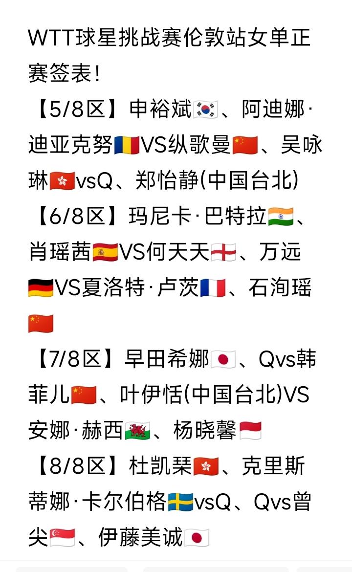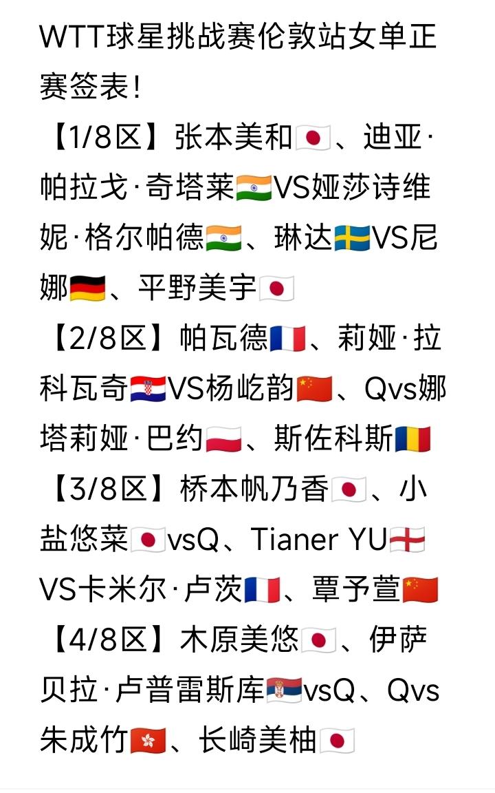 女双比赛国乒组合第一轮就是内战[允悲], 女单比赛覃予萱🇨🇳要撞上桥本帆乃香🇯🇵[奋斗]! 2025WTT球星挑战赛伦敦站正赛签表发布, 女双项目上,首轮对阵有覃予萱/纵歌曼🇨🇳VS韩菲儿/杨屹韵🇨🇳,好气人啊[捂脸],我们总共有两对儿参加正赛的组合,一上来就安排了内战,并且她们还和张本美和/桥本帆乃香🇯🇵组合同一个半区(见图一)。 女单签表上,覃予萱和难对付的颗粒选手桥本帆乃香、有很强实力的直板选手小盐悠菜同在一个1/8区。 张本美和和早田希娜分居上下半区,不到决赛不相遇,这签位可惜了,应该早碰面才是,想看热闹难了[吃瓜群众]。