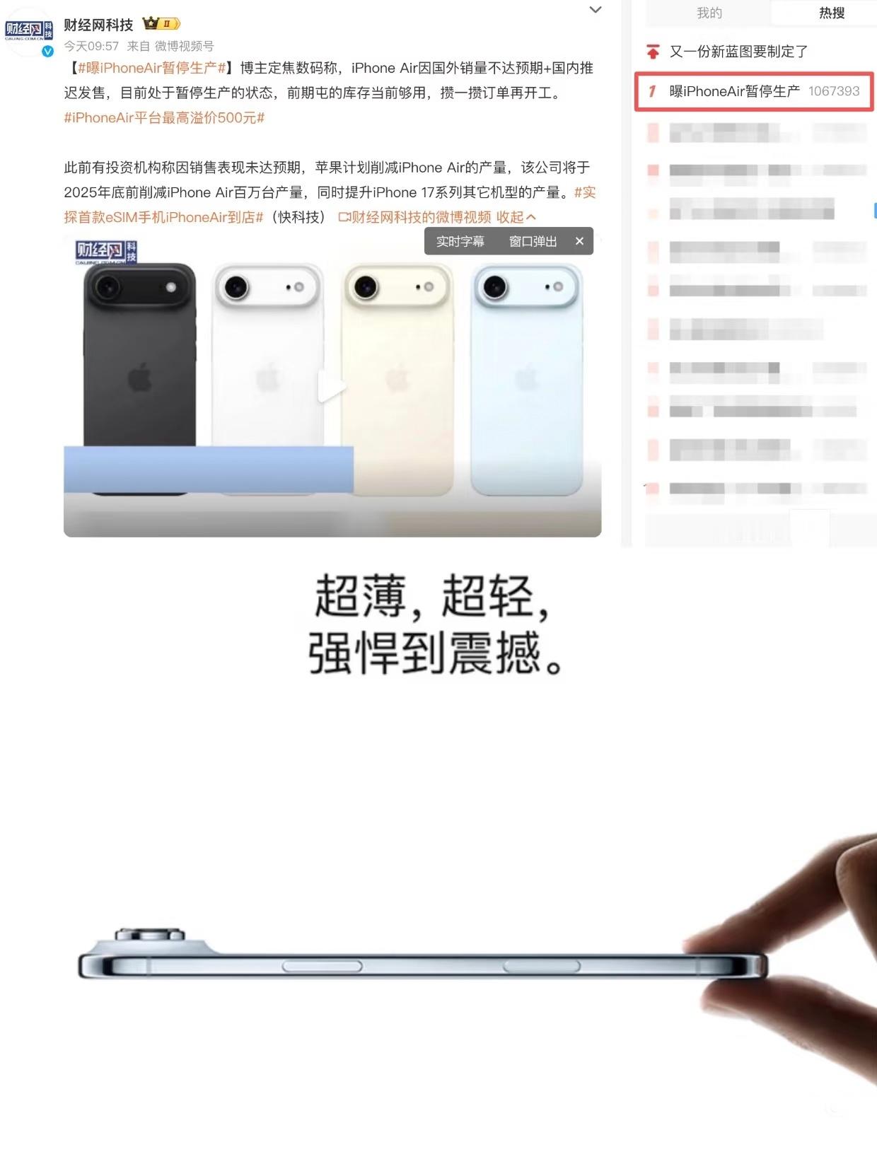 曝iPhoneAir暂停生产销量比预期要低,不管爆料是否属实,都是为了清库存~不知道哪类人选择购买iPhone Air~[二哈]