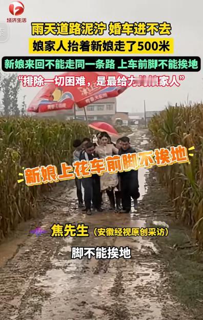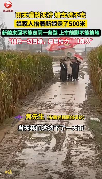 “娘家给的底气真足”!在河南商丘,一位女孩出嫁当天恰遇大雨,导致前来接亲的婚车根本无法靠近女方家。经过众人一番商议,最终决定将婚车停放在苞米地对面。然而,娘家人的这波操作,可谓是将“底气”深深烙印在新娘身上! 近日,河南商丘一场雨天婚礼,让 “娘家给的底气” 有了最生动的注脚。 大雨倾盆而下,新娘王女士(化名)的迎亲路因泥泞受阻,娘家人用最朴实的行动,为她铺就了通往幸福的路,这段视频走红网络,戳中无数人泪点。 当天,迎亲车队刚驶往新娘家所在的村尾,五百多米的泥土路被暴雨冲成泥塘,婚车轮胎打滑,根本走不了。 泥水没过脚踝,新郎和伴郎急得团团转,按当地习俗,新娘出嫁前脚不能落地,否则 “破了喜头”,可这满路泥泞,根本没法行走。屋里的新娘听闻动静,心里很着急,亲友们也都束手无策。 新娘的大伯灵机一动,一声 “抬着走”,打破了沉寂。众人立刻行动,找来两把结实木椅,用红布捆绑成简易 “花轿”。 大伯和两位壮实的堂兄在前头抬轿,新郎贴身守护,伴娘撑伞随行。大雨中,抬轿人深一脚浅一脚,每一步都要在泥里艰难拔腿,原本五分钟的路,足足走了二十多分钟。 新娘坐在 “花轿” 上,紧紧攥着红布,哽咽着不停说 “谢谢”,脸上的妆早已被泪水和雨水冲花。 路边的乡亲们也纷纷伸出援手,有的铺木板垫路,有的用扫帚清理淤泥。 等到 “花轿” 抵达村口婚车旁,所有人都成了 “落汤鸡”,却没人抱怨,脸上满是欣慰的笑容。新娘母亲擦着眼泪感慨:“有这样的娘家人,值了。” 视频传到网上后,网友们纷纷留言点赞。有人说:“这才是真正的娘家底气,不是豪车嫁妆,是有人愿意为你趟泥涉水。” 还有网友分享类似经历:“我们村也曾有过暴雨挡婚路,邻居连夜买石子铺路,都是最淳朴的温情。” 这场被大雨 “搅局” 的婚礼,虽有些狼狈,却藏着最真挚的亲情。所谓的 “娘家底气”,从不是外在的排场,而是危难时刻家人挺身而出的守护,是乡亲邻里不分你我的帮扶。 正如新娘回望那条泥泞路时的心声。这份温暖,足以让她记一辈子,也让她明白,无论走多远,娘家永远是最坚实的后盾。 对此,你还有什么看法呢? 信息来源 :AHTV第一时间