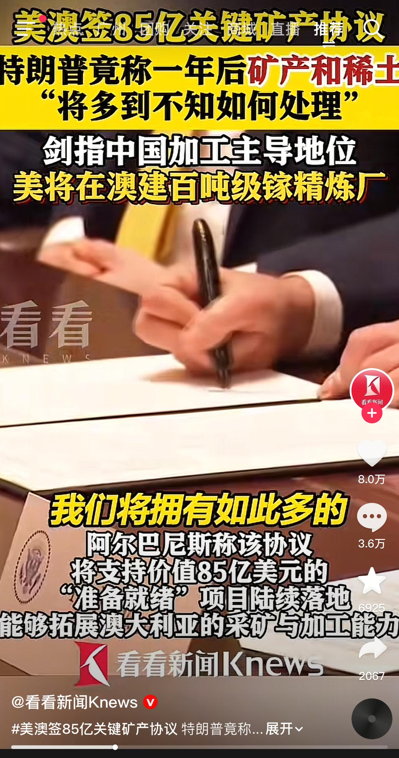 美澳最近签了个85亿美元的大单,核心是联手搞关键矿产和稀土,想把供应链从中国手里抢过来。特朗普直接放话:一年后美国的稀土会多到“堆不下的程度”。 具体做法: 未来6个月,两国先砸30多亿美元,撬动50亿总投资,启动一批“-ready-to-go”项目。 澳大利亚出矿,美国出钱和技术,在西澳建年产能100吨的镓精炼厂,顺便把稀土加工能力也搬过去。 - 两边还成立联合小组,专门协调政策、审批和定价,目标是“不依赖中国”。 他们的股票倒是应声涨了。 不过,稀土产业链长、技术门槛高,中国目前掌握着全球八成以上的冶炼产能,美澳想一年就“堆成山”,恐怕没那么容易。
