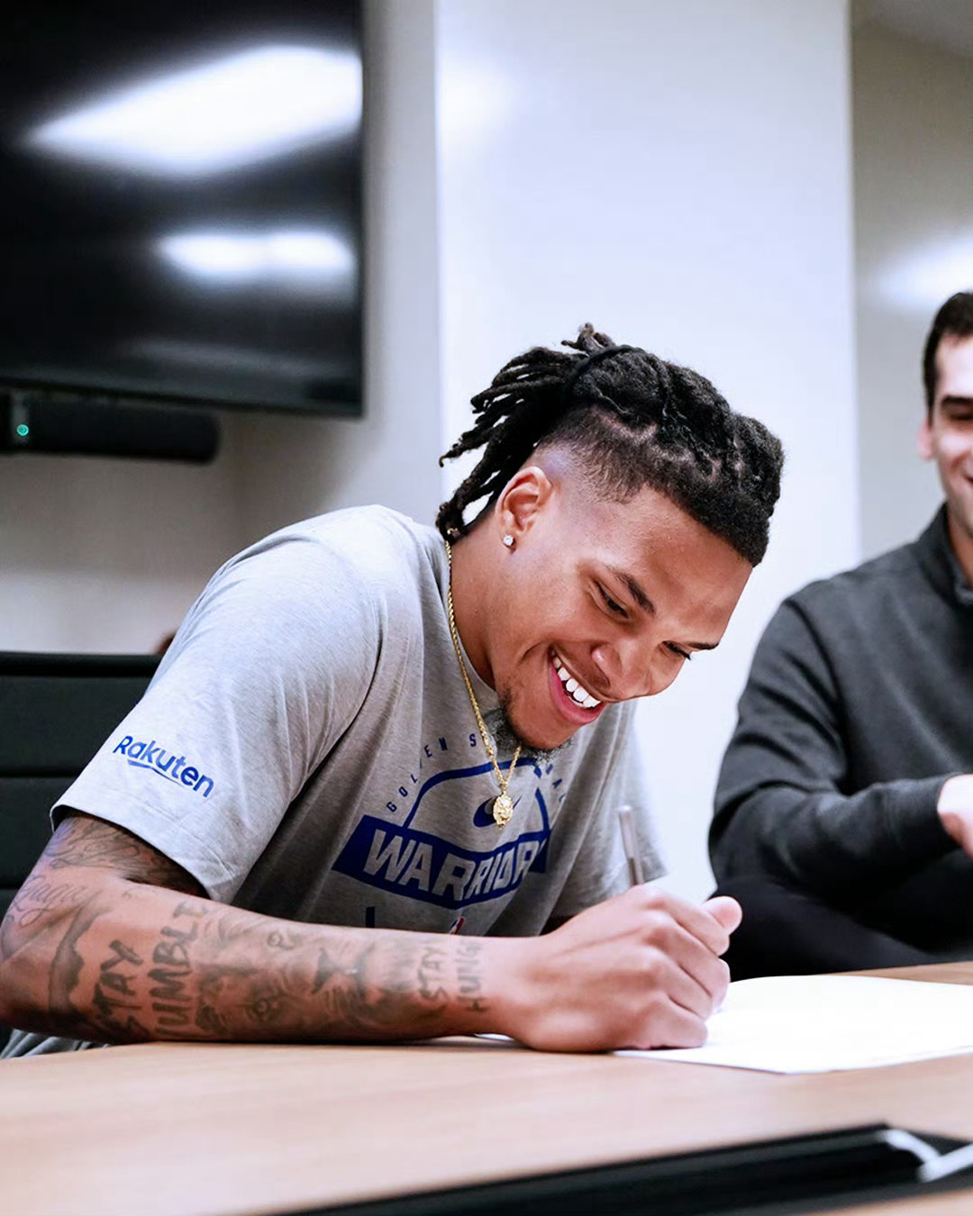 赛后,勇士更衣室内,理查德还被奖励了今天的比赛用球。