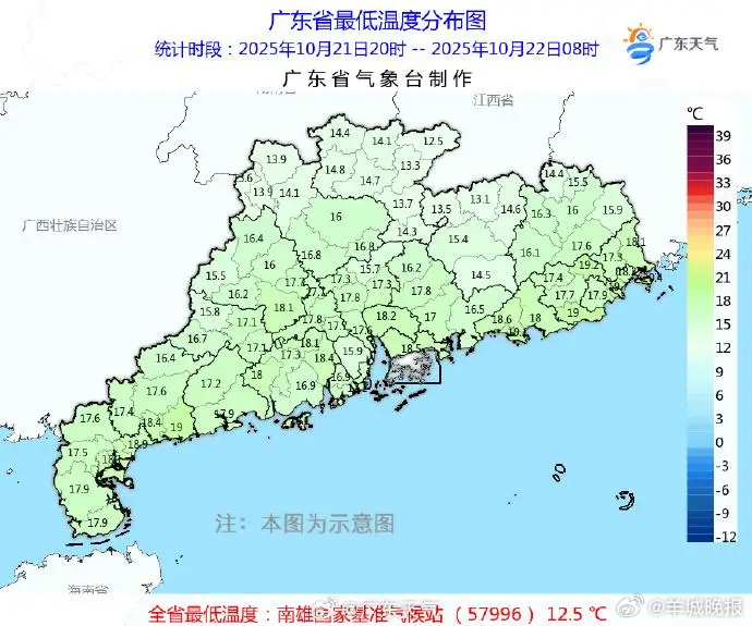 根据广东省气象部门监测,截至22日早晨,广东大部气温继续走低,其中南雄国家基准气候站录得12.5℃低温,为22日早晨广东范围内国家基本气象站当中的最低气温。在广州,广州国家基本气象站22日早晨录得最低气温16.7℃,为今年下半年以来该站所录得的最低气温。
