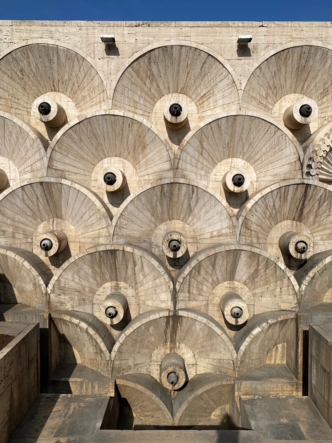 风格融合了现代和传统,呈现出壮丽的阶梯式结构,楼梯向上延展,从下到上分为多个平台,像是一个“瀑布”状的结构。每个台阶之间都有花园、雕塑和其他艺术装置,建筑群内有多个博物馆和艺术画廊。