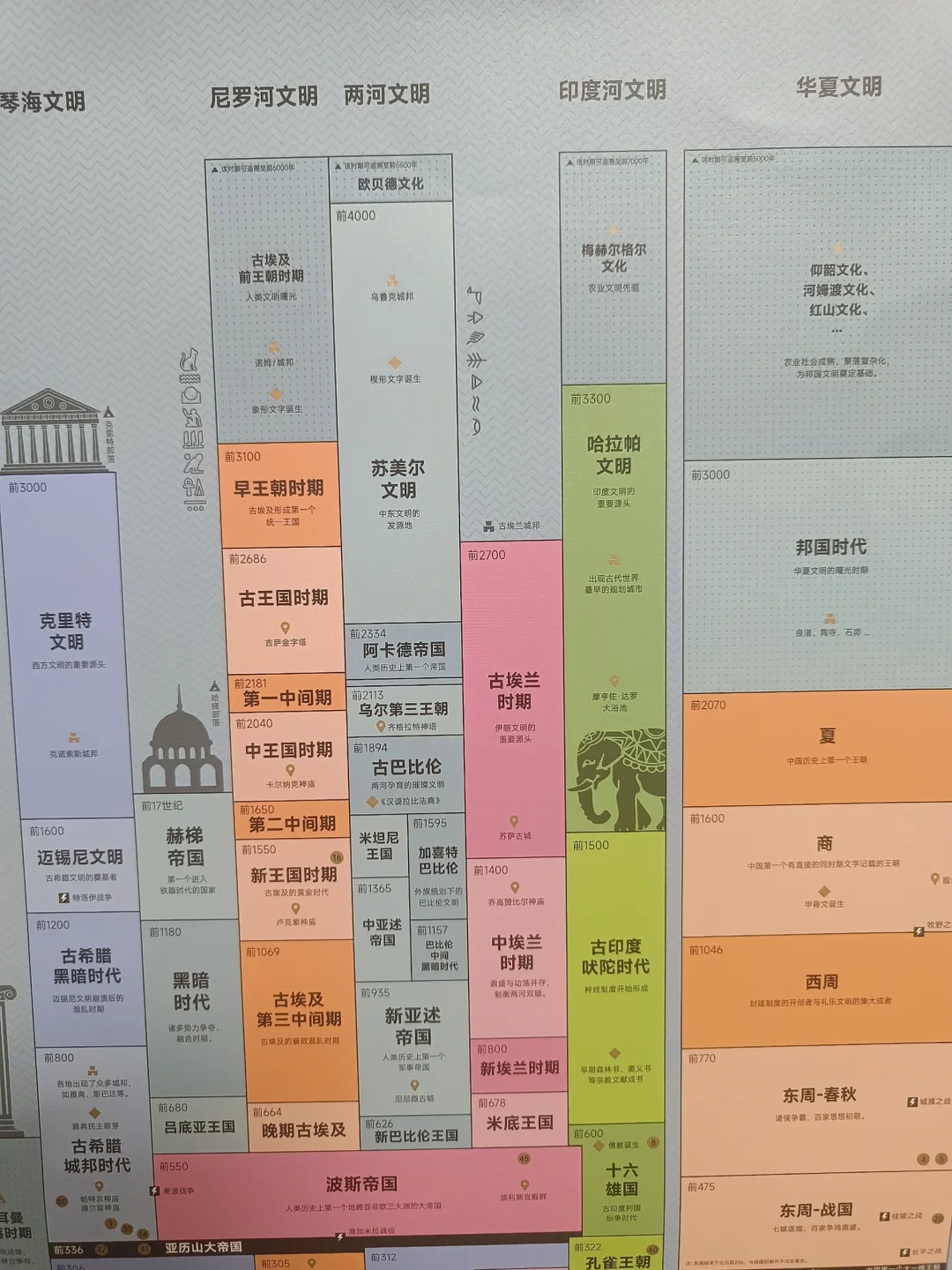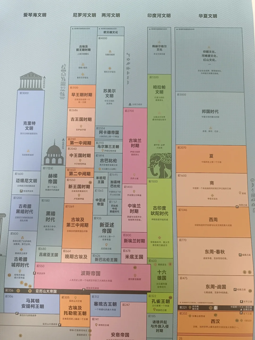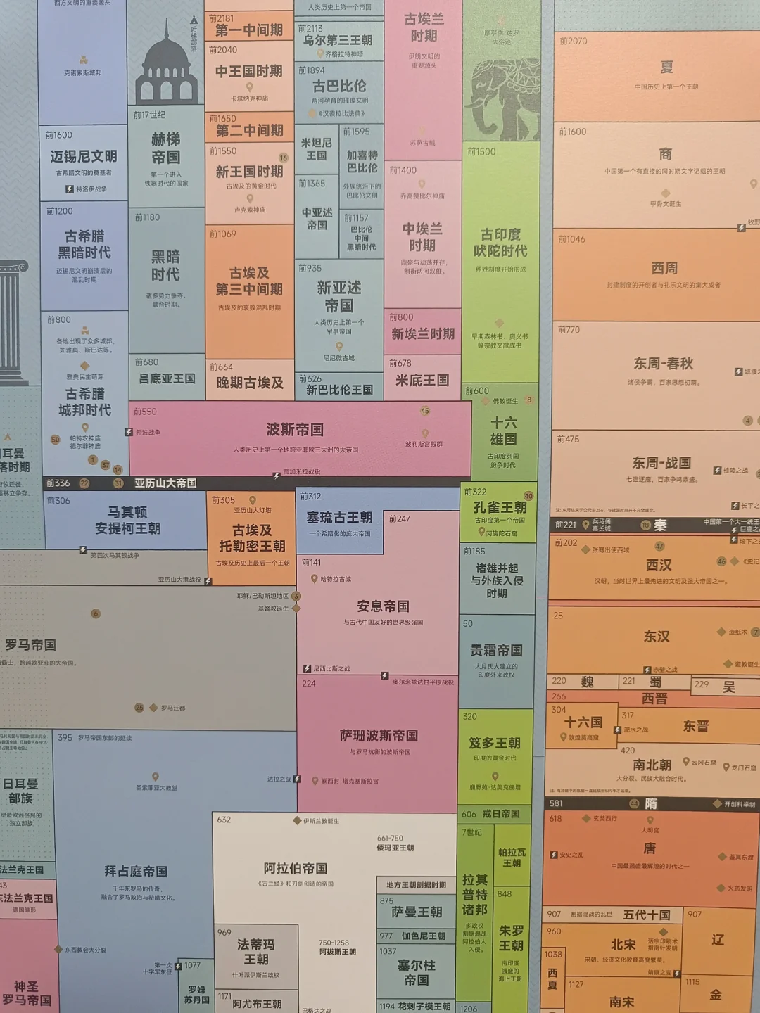 🌈 喜欢历史的宝子们,是否经常被各种时间脉络弄得焦头烂额? 💥看看这份『中西方历史平行时空图』,能让你很直观的了解各个文明的时间脉络,以平行时空的方式,对照中西方文明在同一时期都发生了哪些重要事件? 当东周诸侯争霸,百家争鸣时,遥远之处的亚历山大帝国是如何崛起? 当盛唐大放异彩,万国来朝时,尼罗河文明上演着怎样的故事? 当明朝郑和下西洋时,西方又有着什么动作呢? 🌟按照它的时间脉络走,能帮你归纳出一个系统的历史框架,帮你记住各个历史节点的重大事件,堪称是历史爱好者的福音; 😎另外,它的颜值也蛮高的,样式设计的很有文艺范,不会让人看着有枯燥感,摆在哪里都非常养眼哦!