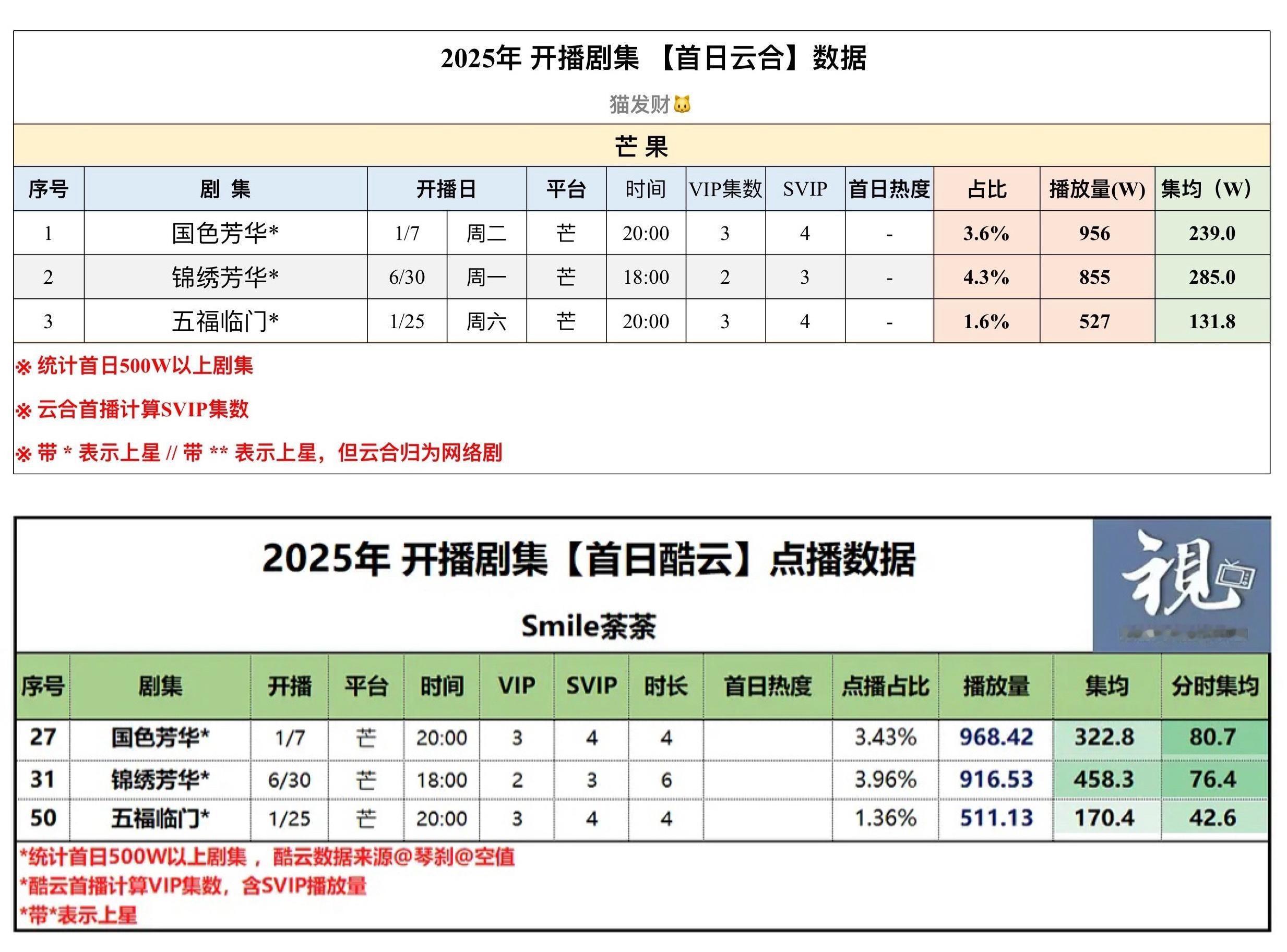 锦绣芳华芒果TV晚上6点开播,首播2+1集,云合首日855,酷云点播首日916,热播期云合年季酷云史亚