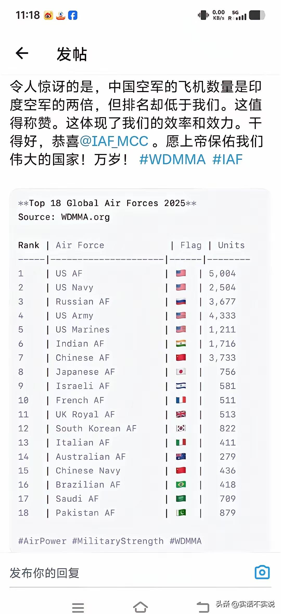 世界最强空军,印度空军排名第三,中国排第四,这个排名过去一周了,引发全世界网友热烈讨论,通过观察,至少99%以上中国网友认为: 1,中国排名被高估,应该排20位以下,我们被这个杂志捧杀。 2,中国空军明显火力不足,体系化不足,需要继续努力。 3,印度空军,韩国空军明显被低估,正确的排法是,韩国空军等于美国空军➕韩国空军,韩国第一,印度第二,美国第三。 4,中国网友都有自知之明,嘴巴上都说我们不在乎排名了,实际上因为不是印度对手,显示出中国网友更加理性。 5,这个排名是一名在CDMMA工作的印度主编所写。印度主编非常专业,并且不否认自己与美国还有很小的差距,他认为虽然印度已经明显超越俄罗斯,但是为了和友好国家搞好关系,客套地把俄罗斯排第二。