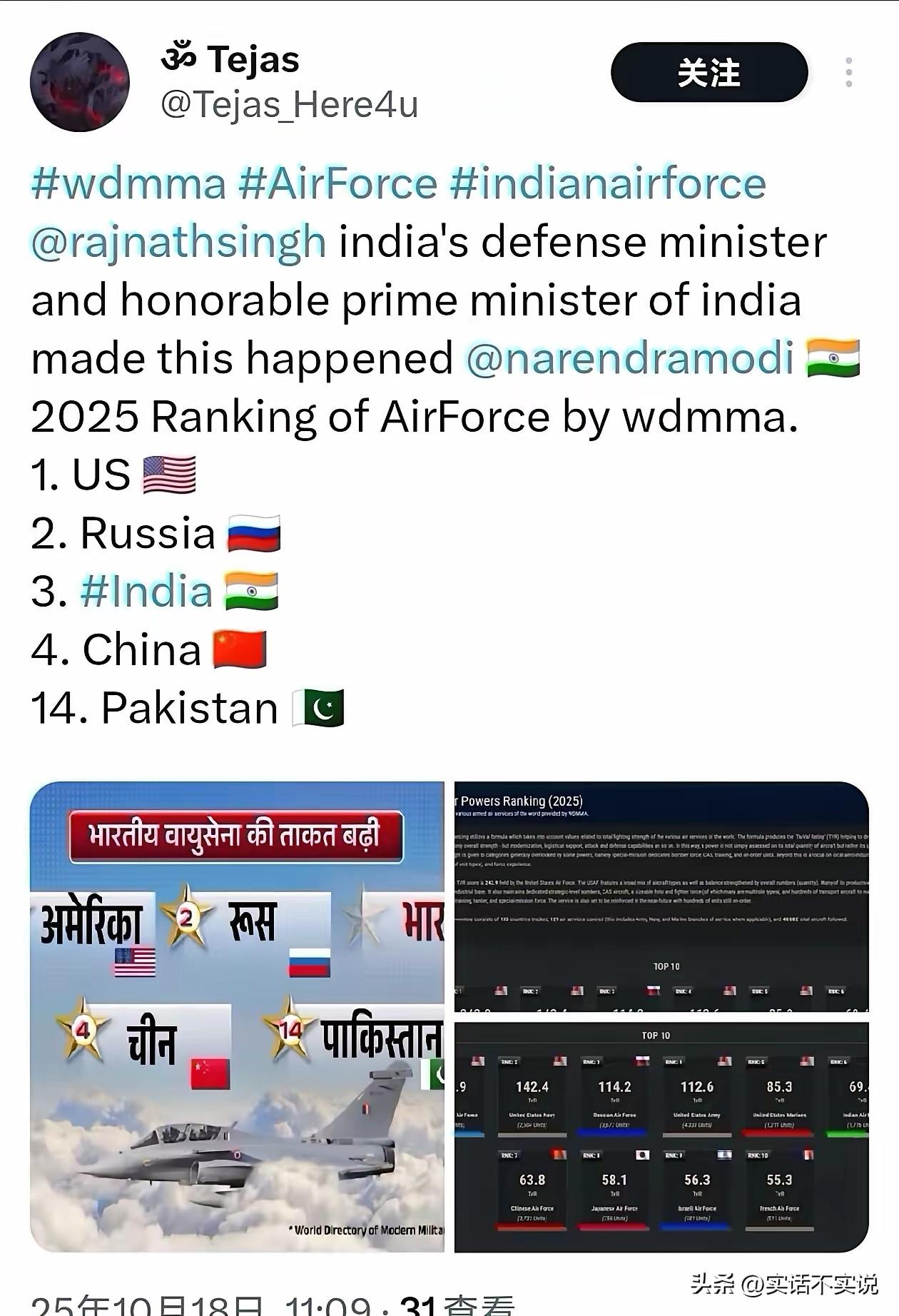 世界最强空军,印度空军排名第三,中国排第四,这个排名过去一周了,引发全世界网友热
