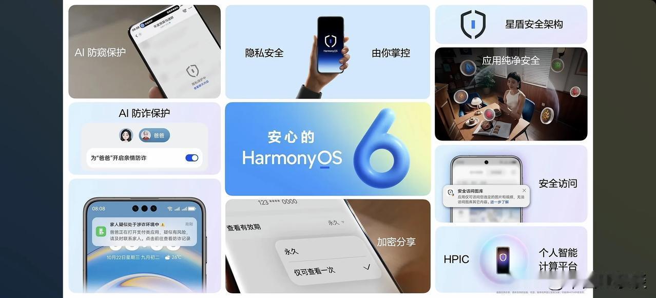 鸿蒙已拦截超240亿次不合理权限!鸿蒙操作系统通过首创的安全访问机制,帮助用户真正实现“隐私安全,客户掌控”。鸿蒙六星盾安全架构再升级,全新的AI防诈支持亲情防诈保护功能,能够帮助用户远程守护家人。 鸿蒙6全面构筑智能化的主动安全,鸿蒙加密分享支持仅可查看一次,加密分享不仅能限制查看对象,还可以设置让对方仅可查看一次,将分享数据的主动权掌握在用户手中。AI防窥功能,可以实时识别他人注视,智能隐藏应用内容,让数据仅用户可见,带来更安全、更省心的体验。 升级鸿蒙6流畅度最高提升40%!方舟引擎全面升级,鸿蒙6流畅体验再度跃升,通过软硬芯云系统级优化,流畅度较鸿蒙5升级后提升15%、较鸿蒙4升级后提升40%,带来“秒启秒开秒加载”的体验。对15款游戏支持游戏快启,启动速度提升5倍,让流畅、高效的体验覆盖每一处使用场景。