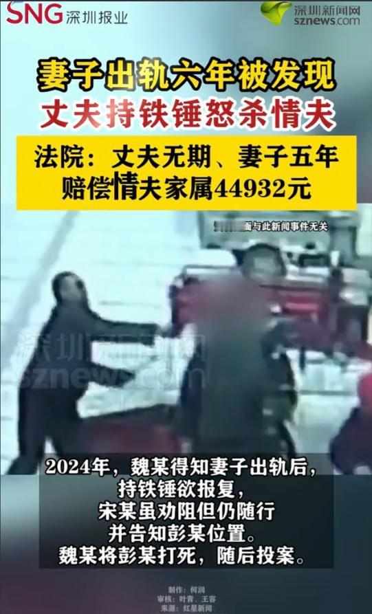 自古奸情出人命!湖北咸宁,妻子背着丈夫出轨情夫6年。6年后,丈夫从妻子口中得知她是被胁迫的,遂怒不可遏,操起铁锤在妻子的引导下找到情夫,随即将情夫锤杀致死。事后,夫妻二人双双获刑,如何评价此案? 在湖北咸宁,一场悲剧性的命案让人无法不深思,丈夫魏某因用铁锤杀死情敌彭某被判无期,而妻子宋某却仅获刑五年。 这两者之间巨大的刑罚差异,背后并不是简单的案件处理,而是对宋某在事件中复杂角色的精准裁定。 从表面看,宋某是个受害者,她与丈夫魏某有着十七年的婚姻和两个孩子,但她却背叛了这个家庭,和彭某有了长达六年的地下情,当丈夫得知真相后,愤怒至极,但宋某坚称自己是被情人胁迫,陷入了一种无法自拔的困境。 可是事情远不像她所描绘的那么简单,面对丈夫愤怒的质问,宋某没有积极制止,也没有尝试平息冲突,反而,她并没有阻止魏某拿起铁锤,甚至主动告诉丈夫彭某的工作地点,像是指引他去复仇的“引路人”。 这一行为彻底揭穿了她所谓“被胁迫”的辩解,一个真正被胁迫的人,怎么可能主动带着丈夫去杀自己的情人呢? 当悲剧发生后,宋某又是第一个拨打了急救电话,这种行为的矛盾,使得案件更为扑朔迷离,她一方面似乎在推动事态的发生,另一方面又在事后做出反应,保持一种看似无辜的姿态。 法院判定魏某无期徒刑是合情合理的,他拿着铁锤,带着杀意,冲向彭某,造成了对方的死亡,这是一个明显的故意杀人行为,没有争议。 而宋某,虽然在这一过程中没有直接动手杀人,但她的行为仍构成了“帮助犯”,她的主要罪行是“引路”,即协助丈夫去找情敌,导致了暴力行为的发生。 宋某的行为被定性为故意伤害的“帮助犯”,判了五年,这一判决,聚焦的并不是她是否直接实施了暴力,而是她在情感背叛、言语刺激和实际帮助中的角色,法律审视的,不是她是否拿了刀,而是她的内心动机和行为后果。 整个案件的根本问题,还是宋某的选择,2018年,她通过社交软件认识了彭某,从而为家庭埋下了祸根,造成了长达六年的情感背叛。 而当婚外情暴露后,她那句“被胁迫”的辩解,不仅让丈夫愤怒情绪升级,还为暴力冲突提供了催化剂。 在魏某的怒火中,宋某的“引导”起到了至关重要的作用,没有她的指引,魏某的暴力可能只是停留在愤怒的言语中,但她的行为,精准地将怒火转化为现实的行动。 宋某并不是完全无辜,也不是纯粹的恶魔,她的行为让她处于一个复杂的灰色地带。她既是婚姻中的背叛者,又是丈夫暴力行为的引导者。 在这场家庭悲剧中,宋某成了至关重要的环节,她的每一个决定,都在推动着这场灾难的发生,从背叛到激化冲突,再到实施暴力,她的一系列选择最终将丈夫推进了深渊。 法庭判定宋某为“帮助犯”,并没有给她“无辜”的标签,她不仅没有为家庭的完整和谐尽力,反而成了灾难的催化剂。 她既不是一个无辜的受害者,也不是一个纯粹的加害者,而是一个因自私和软弱导致悲剧的关键人物,她的每个选择,最终都让这场悲剧走向了无法挽回的结局。