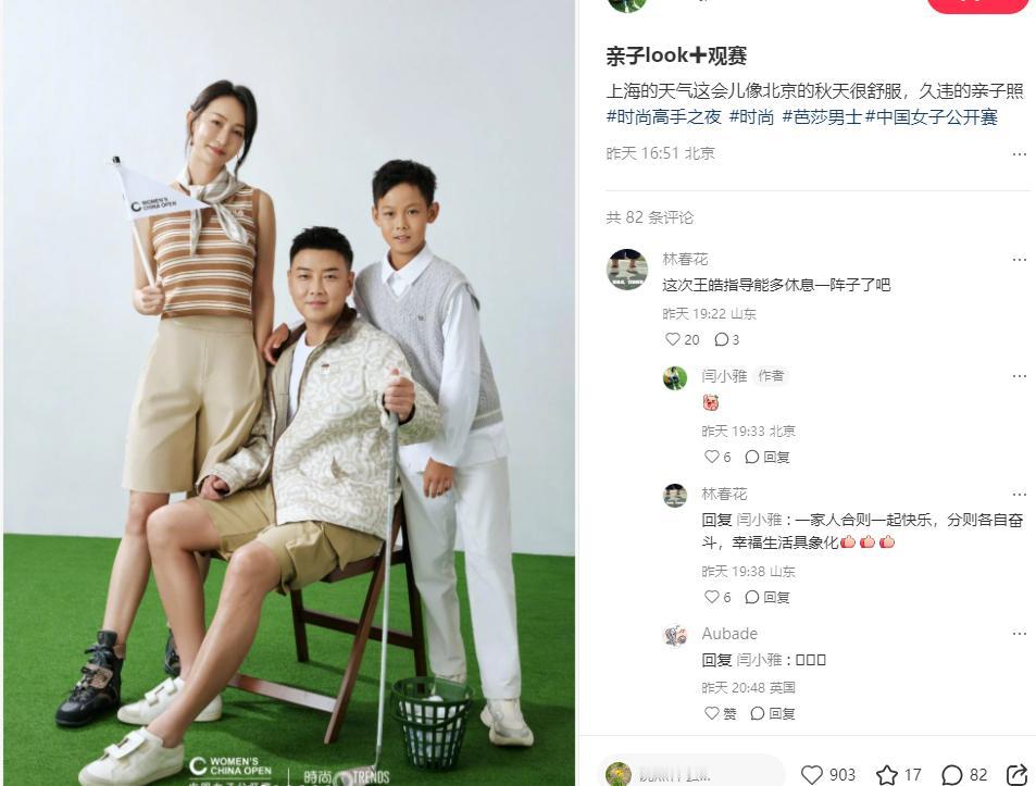 王皓这次能多休息几天了。 王皓从印度回来后,还和小雅一起陪海苔去上海参加高尔夫球的活动了,一家三口还拍了难得的亲子照,就是少了螺螺,看到有网友说:“小雅姐的三位男嘉宾凑齐好难呀,不是训练是比赛,不是比赛是上学。”看到小雅还回复了说确实是这样的,海苔这孩子看着就长大了,高尔夫打的也不错,海螺是从小学习乒乓球,现在也开始参加一些比赛了,小雅把两个孩子培养的都很好。 亚锦赛结束后,梁靖崑发了动态,小雅来留言说看着大家都瘦了,就皓哥没有瘦,梁靖崑跟小雅姐说王皓教练压力最大,回家了多给他补补。这不回到家后,王皓和家人在一起时,心情是真的很好啊,一下子就年轻了,一家四口都是高颜值。看到有网友说:“哈哈哈,怎么是皓哥坐着露腿拍照。”小雅回复说:“得把瘦的地方露出来”。 看到下一站的WTT蒙彼利埃冠军赛,王楚钦、林诗栋、梁靖崑都退赛了,那王皓应该就不跟赛了,志强教练估计会跟赛。这段时间运动员们都回省队备战全运会了,王皓也能多休息几天,好好陪陪家人。
