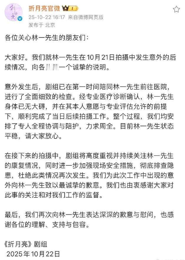 折月亮剧方回应 《折月亮》剧方回应林一受伤事件了~[哆啦A梦吃惊]