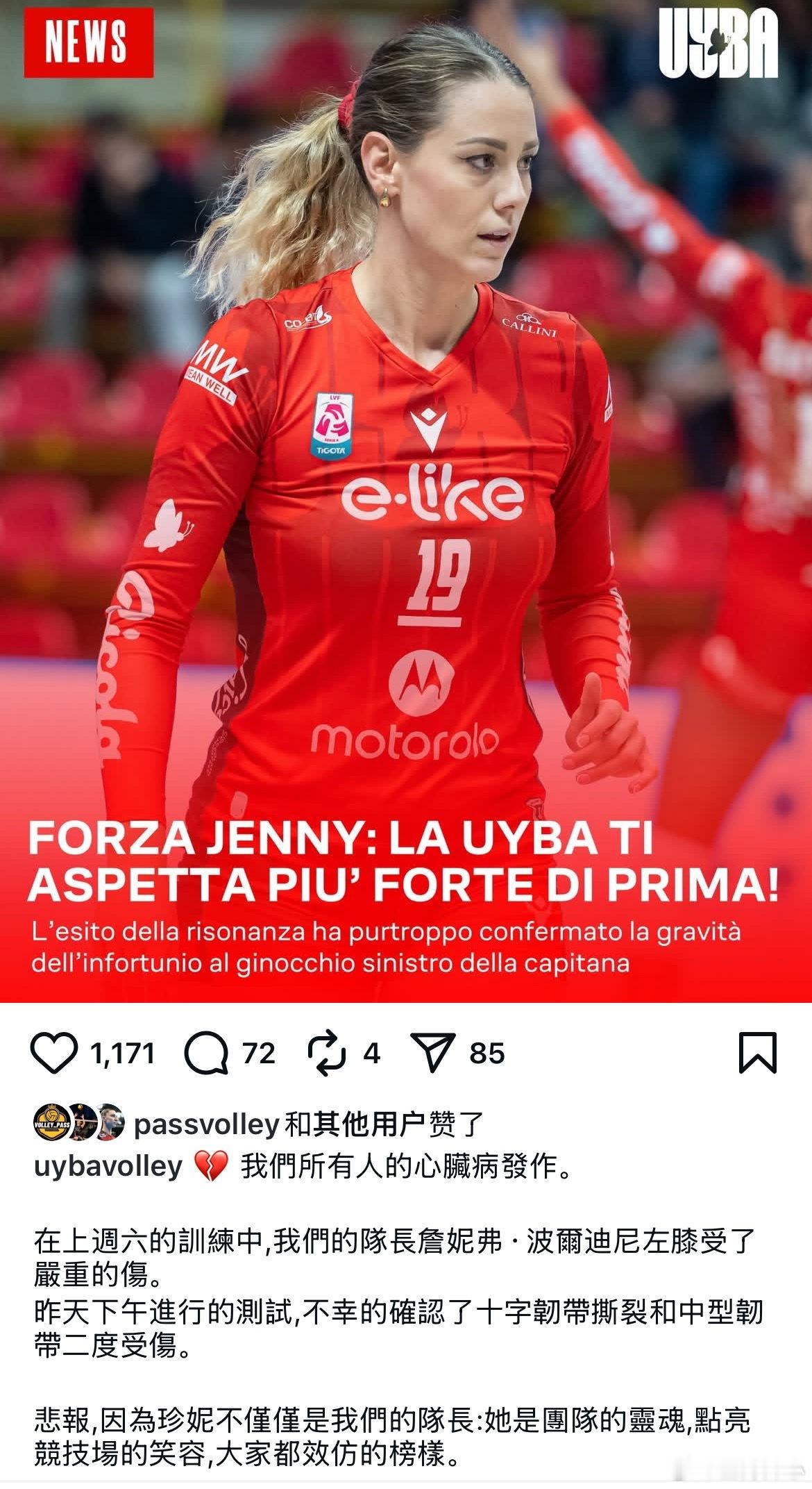 世界女排新闻 来自意甲女排俱乐部布斯托的突发消息:球队队长二传手博尔迪尼在上周的训练中受伤,目前的检测结果确认是十字韧带撕裂和中型韧带二级损伤。那二传线只有关菜菜巳一个人扛,估计后面肯定转会新二传,住早日康复!