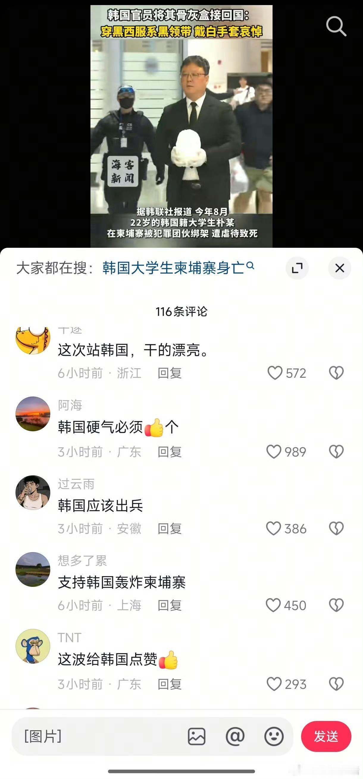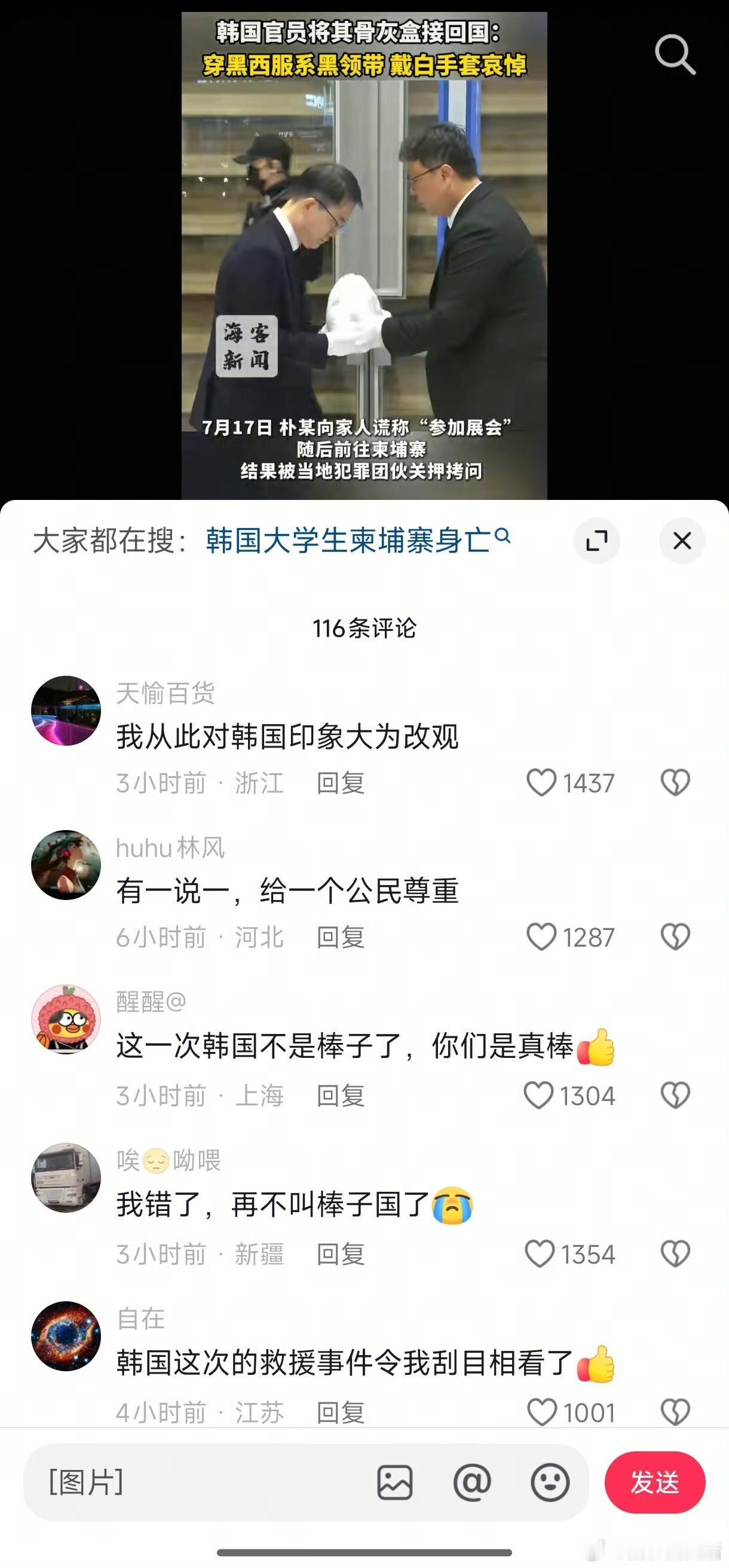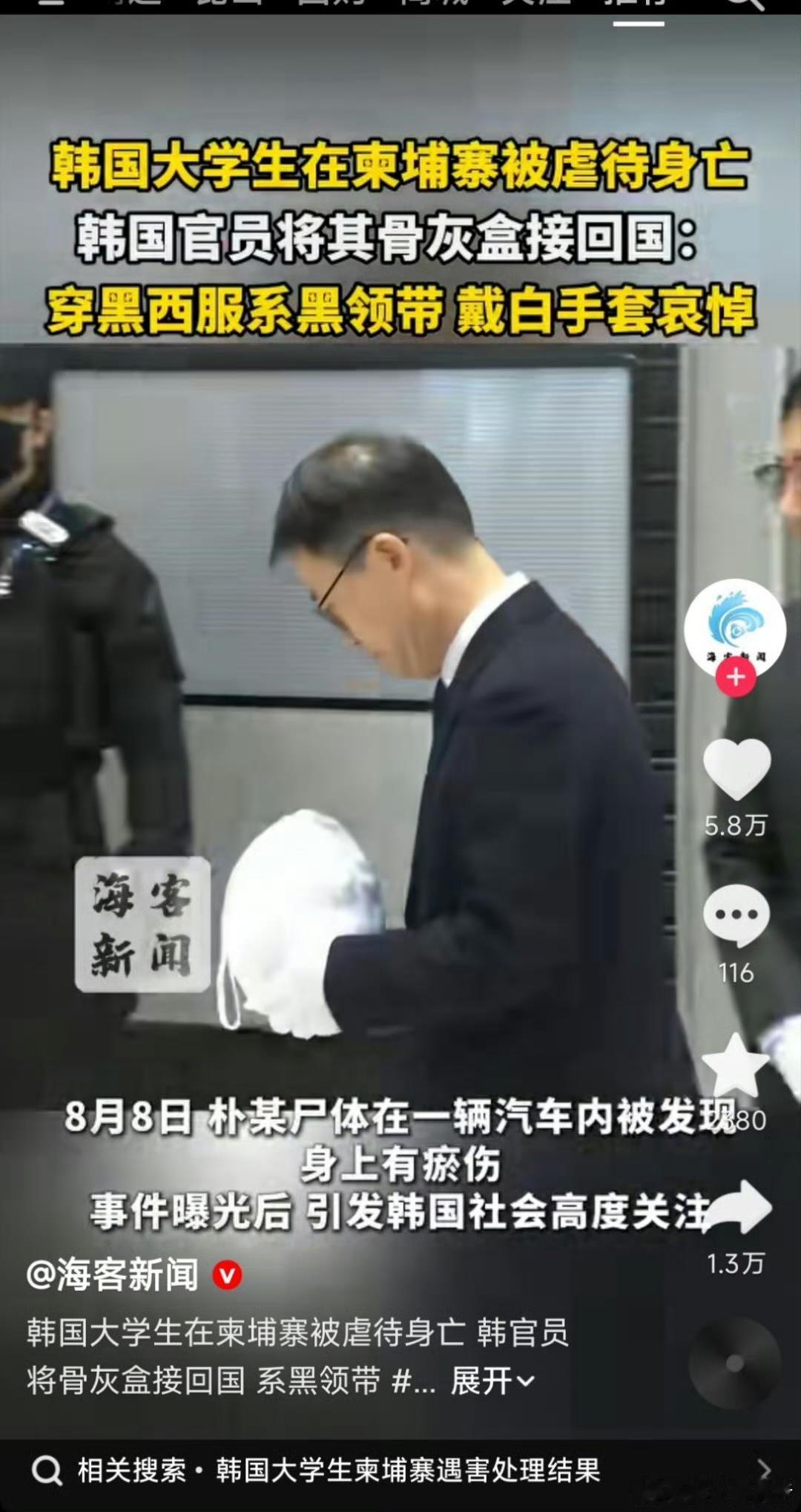 韩国这几天在“反诈”方面动作频频,给自己赚足了面子! 继美女官员亲赴柬埔寨协商应对愈演愈烈的电诈态势之后,又有韩国官员亲自捧回大学生骨灰盒,再次刷得一波好评! 不得不说,娱乐业发达的韩国,深谙如何打造维护形象,完全可以由被害者家属捧回骨灰,他们偏要派官员穿西装,戴手套,在镜头前捧着骨灰慢慢走,闪光灯乱闪一通,政府爱民如子的形象这就立住了。 我们网友也清一色给予点赞好评,细细一想,此举到底有什么实际意义,好像也没有太大意义。其实这就是政府的“公关手段”,真的没有什么好称赞的。