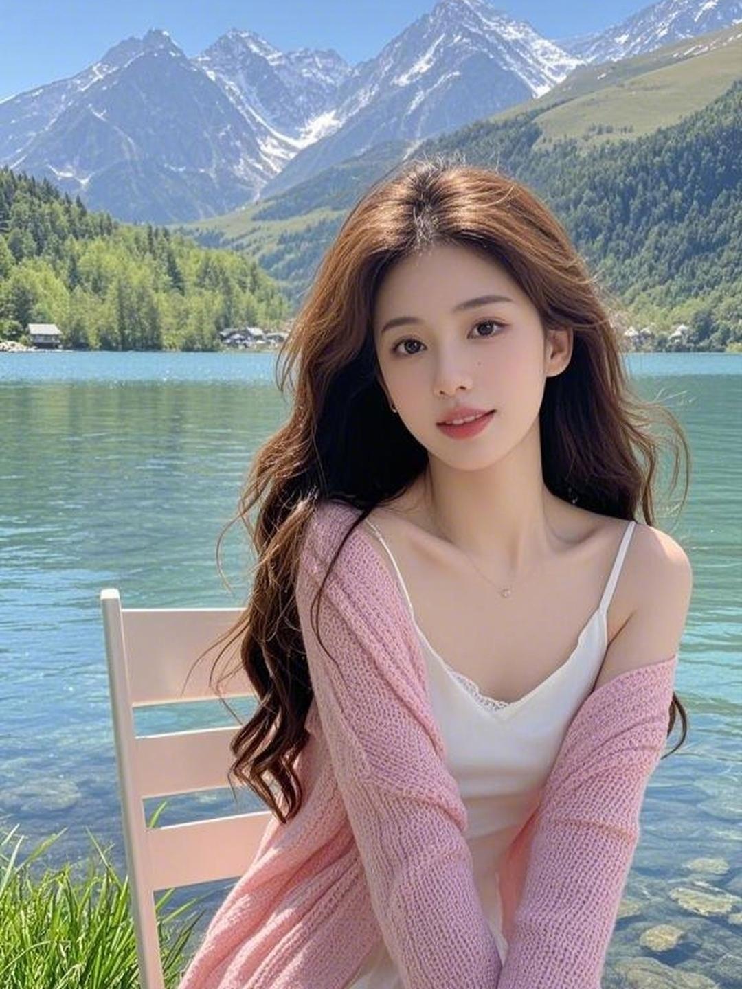 海浪把晚霞揉进碎金里,她披着风坐在礁石上,像朵刚被海风吹开的白栀子。蕾丝裙边跟着