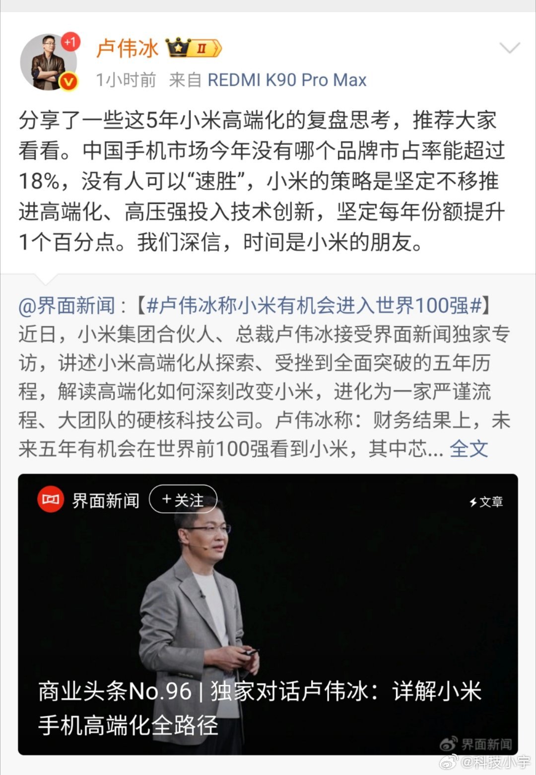 卢伟冰称小米有机会进入世界100强有梦想才有动力,从“性价比”到“抢苹果、夺三星