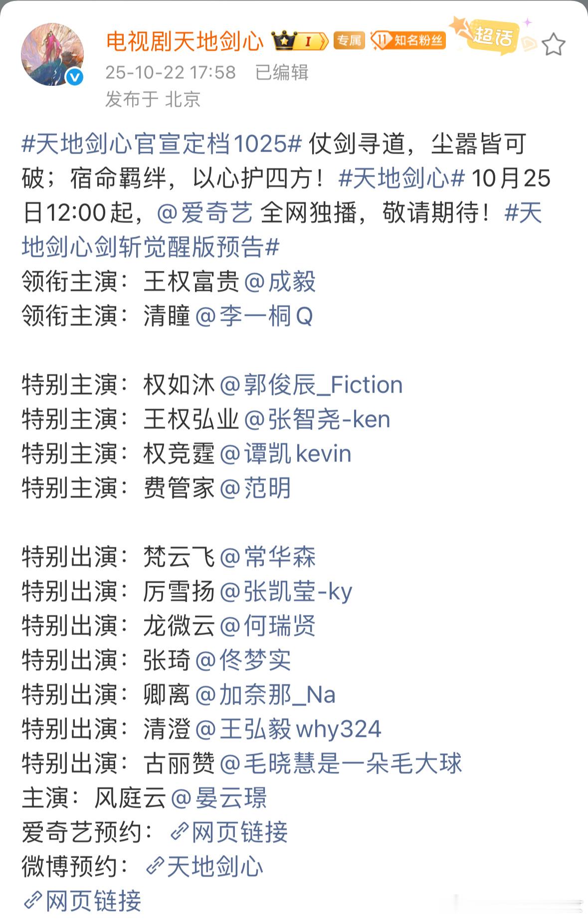 天地剑心定档了!!!10.25中午12点开播!!!天地剑心从官宣到定档都是如此卧