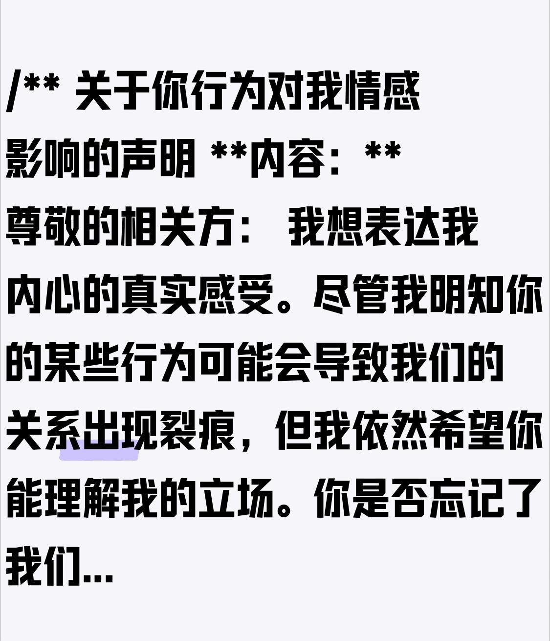 标题/** 关于你行为对我情感影响的声明 **内容:** 尊敬的相关方: 我想表达我内心的真实感受。尽管我明知你的某些行为可能会导致我们的关系出现裂痕,但我依然希望你能理解我的立场。你是否忘记了我们曾经的美好?你这样做,实际上是在逐渐失去我,也在逐渐淡忘我曾经的模样。我希望我们随笔致歉 对陌生人的道歉