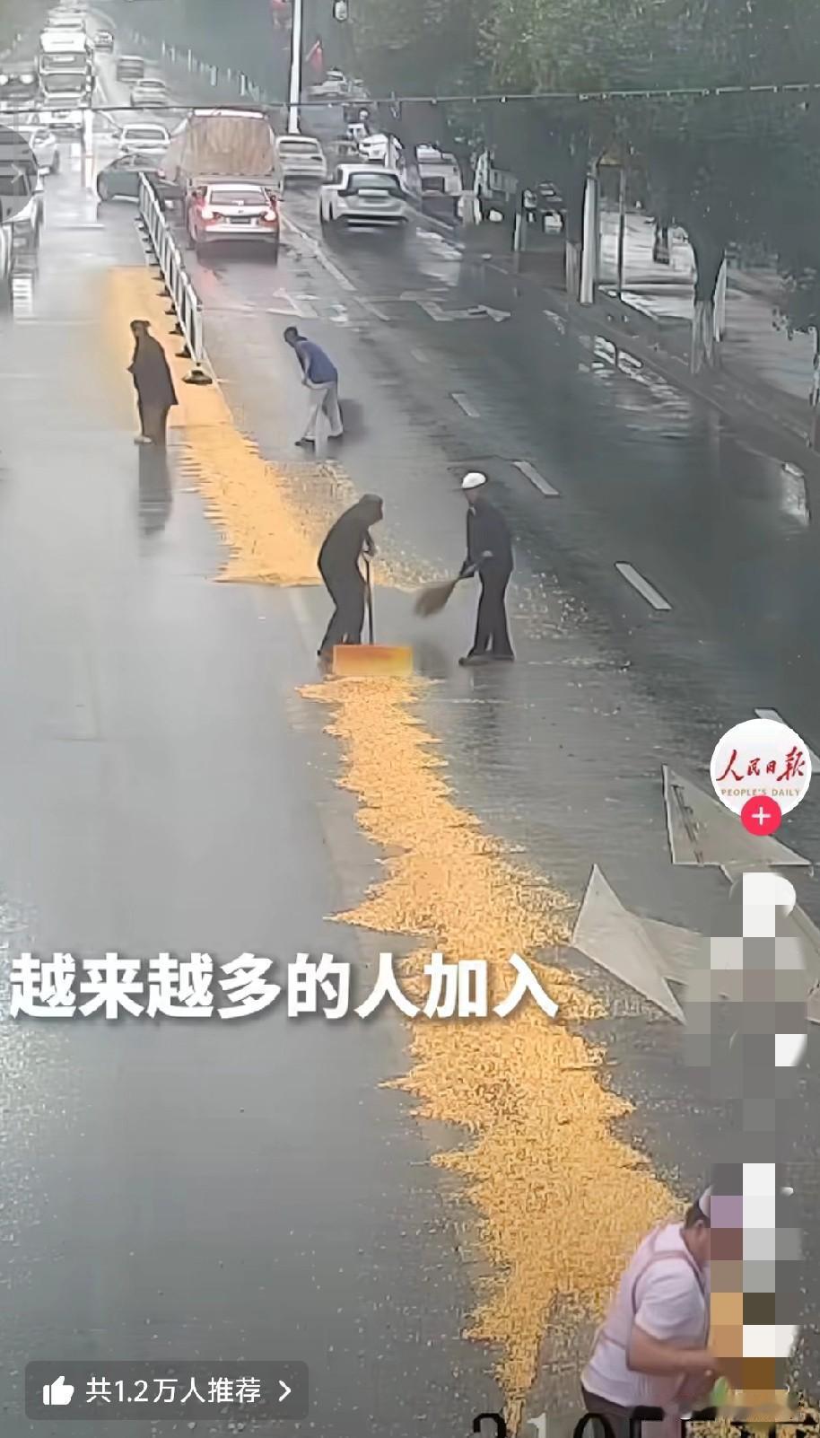 看到人民日报转载的这一幕: 近日新疆一辆满载玉米粒的货车半路“洒金”,司机愣在原地时,一群素不相识的路人却扛起扫帚冲了上去。 你以为这只是一场普通的路面清理? 不!这是人性温暖的“集体爆发”。没有谁号召,没有利益驱使,大爷大妈、路过的上班族甚至交警,就这么自发组成了“收玉米天团”。在雨天的湿滑路面上,他们弯腰挥帚的身影,比任何精心策划的正能量营销都动人。 在这个人人喊着“别多管闲事”的时代,这群新疆人的举动狠狠打了脸——善良从不是稀缺品,只是需要一个触发的瞬间。当我们习惯了网络上的口水战,现实里的这波“操作”才是最硬核的治愈。 你有没有被陌生人温暖过的瞬间?来评论区聊聊,让这份善意接力下去!
