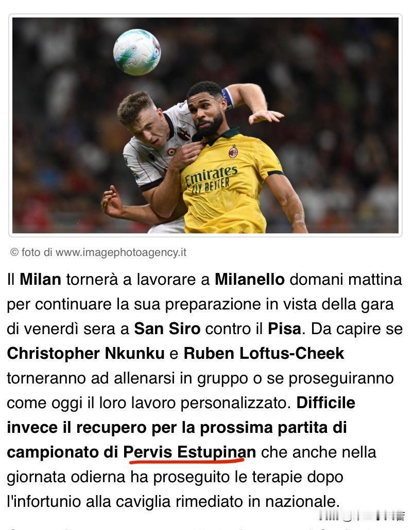 埃斯图皮尼安的脚踝问题比想象的要严重!最新消息埃斯图皮尼安不太可能在下一场联赛恢复,他今天仍在继续治疗国际比赛日期间脚踝受伤的情况,今天米兰消息说埃斯图皮尼安脚踝问题依然严重,他很可能在本周无法参加球队合练。 周五晚上在圣西罗球场米兰对阵比萨埃斯图皮尼安这场不参加也没啥问题,毕竟比萨还不值得冒险,不仅仅是埃斯图皮尼安,恩昆库和普利西奇也一样,比萨都不值得冒险,好好休息争取以良好的状态对阵亚特兰大。 这个埃斯图皮尼安有本纳赛尔的潜质,貌似来米兰这两个月就去过两次国家队,每次回来都养伤,当然埃斯图皮尼安每次都是小伤,问题就是米兰队医对伤病的理解和正常医生有区别,要不然就是误诊导致伤病加重比如莱奥,要不然就是一些不起眼的问题一直治不好,比如恩昆库,所以未来球员去国家队受伤请在国家队治疗好了再回来。