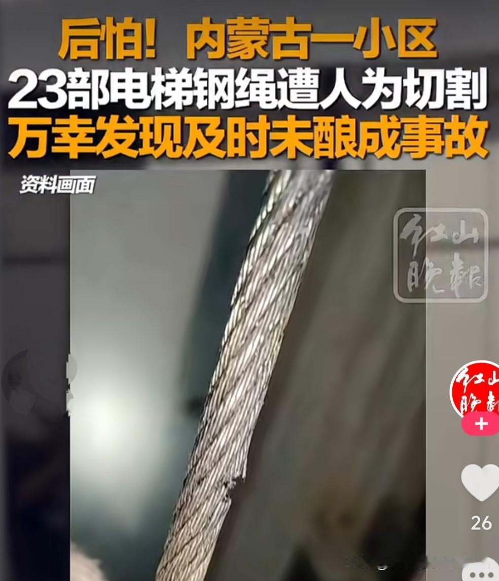 这也太吓人了吧,以后谁还敢乘坐电梯啊。 呼和浩特一小区,23部电梯钢丝绳遭人为切割破坏,幸亏发现及时,才没有酿成事故。不过这事挺蹊跷啊! 第一,这么粗的钢丝绳没有专业工具也切割不了啊。 第二,电梯钢丝绳在电梯房里,一般人也接触不到啊。 第三,费劲巴拉地把电梯钢丝绳切个口子到底图啥啊? 第四,一下子就破坏了23部电梯,这得多长时间啊,怎么没人发现呢? 公安部门要抓紧破案,一定要查个水落石出,否则老百姓怎么能安心乘坐电梯呢? (图片来自网络截图)