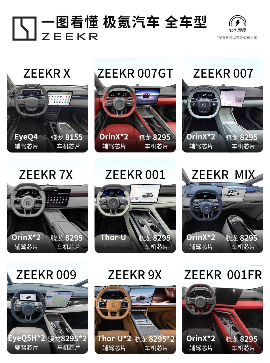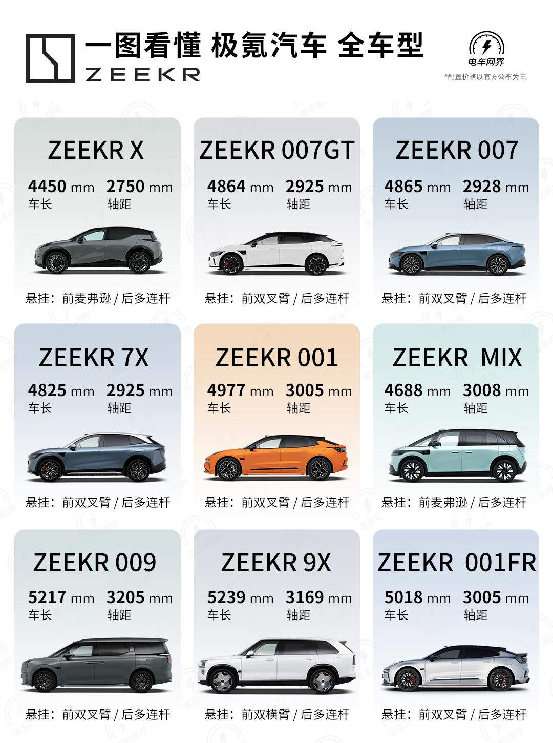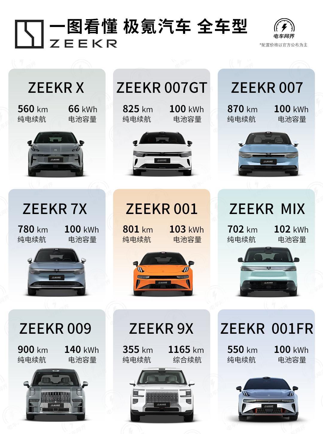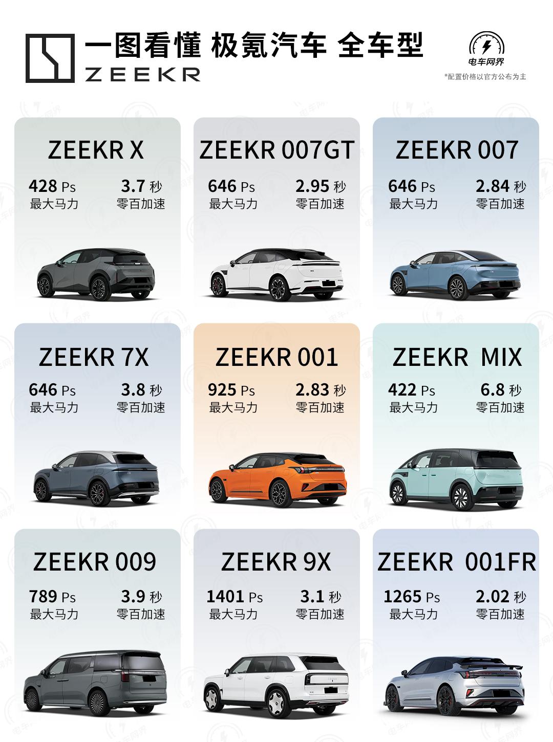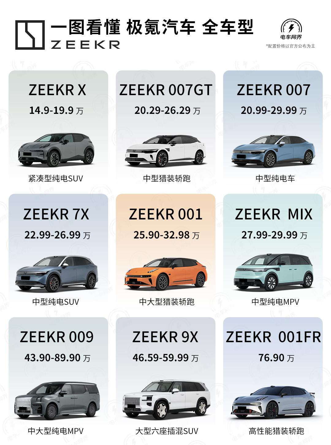 极氪作为吉利集团旗下的豪华电车品牌,以纯电车型为主(当然也有一款插混SUV刚上市),如果你对它们感兴趣的话,那就带你简单了解一下它吧。 销量主力:极氪001 & 极氪7X & 极氪007 极氪001是品牌的常青树和销量基石。焕新版本在900V高压平台、925匹马力、激光雷达和舒适性配置(如伊姆斯躺椅)上全面升级,精准抓住了消费者对“水桶车”的期待——即没有明显短板。 极氪7X则更注重家庭实用性和智能体验,同时拥有安全、性能、空间、豪华配置和智能化为一体的豪华纯电SUV。 极氪007则凭借全系800V架构,在主流的轿车市场提供了快速的充电体验和前沿的科技感。 个性与实用:ZEEKR X & ZEEKR 007GT & 极氪MIX 这三款车型瞄准了追求独特和生活品质的用户。 ZEEKR X以其精巧的身材、不错的性能体验和创新的四/五座布局,成为了都市精英的时尚单品。 极氪007GT作为20万元级高颜值纯电猎装车,是一款集高性能、豪华配置与实用空间于一身的全能GT。 而极氪MIX独特的对开门设计,预示着它将在空间利用率上带来惊喜,专为家庭场景优化。 空间旗舰:极氪009 & 极氪9X 极氪009是极氪在豪华MPV领域的旗帜,凭借出色的安全性、超长续航和豪华配置,成为了高端商务接待和多人口家庭的选择。极氪9X是一款集顶级豪华、创新科技与强悍性能于一身的国产旗舰SUV,被誉为“平替版库里南”,重新定义高端SUV该是什么样的。 性能担当:极氪001 FR 作为极氪001的高性能版车型,其2.02秒的零百加速成绩拥有高达1265匹的马力,是一台集超跑性能、SUV通过性、旅行车空间与猎装美学于一身的全场景豪华猎装超跑。 在这些各具特色的九款车中,你对哪一款极氪最感兴趣呢?【来自懂车帝车友圈】