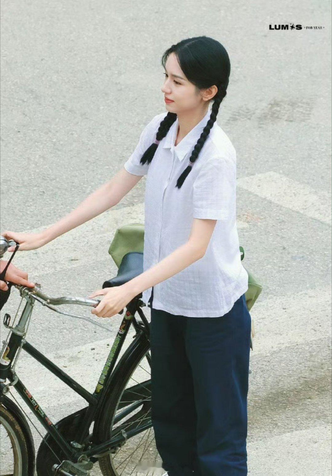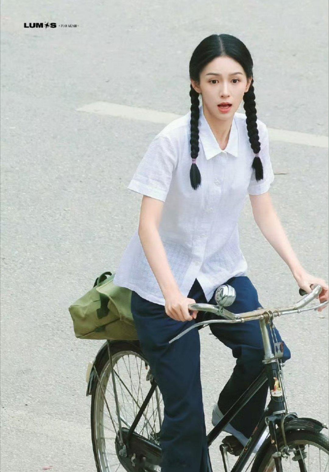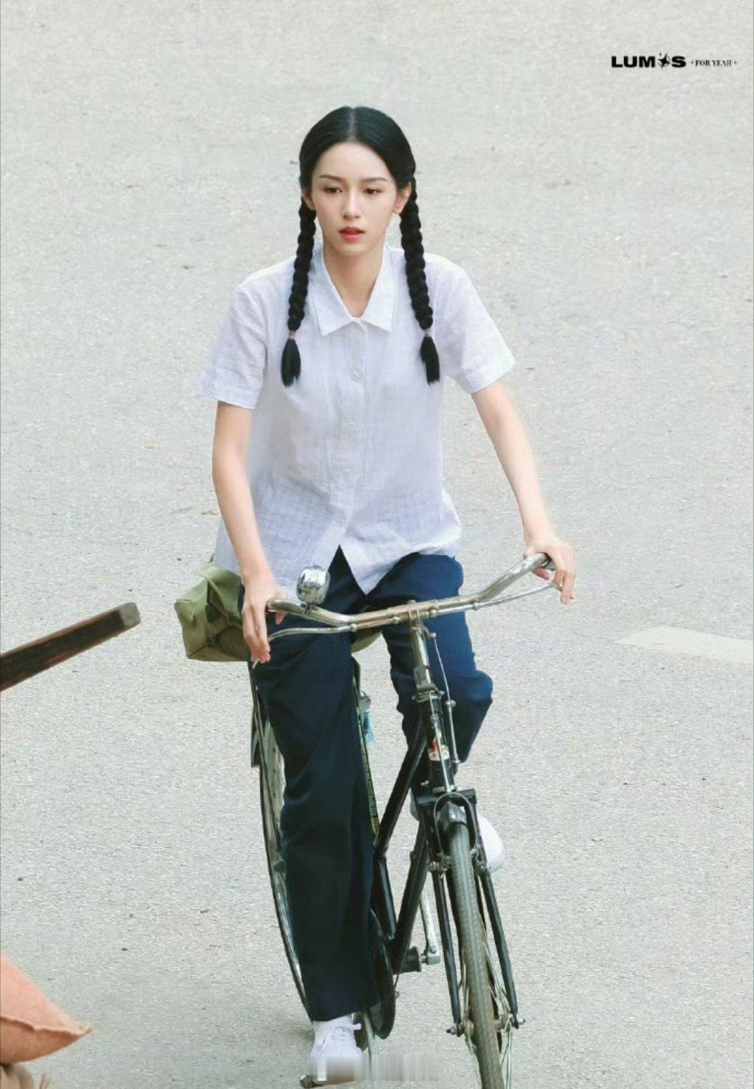周也今日份新剧《红舞鞋》最新路透来了,扎着双马尾辫子、 穿着白衬衫、骑着二八大杠自行车的周也,总感觉好像少了点接地气的模样……