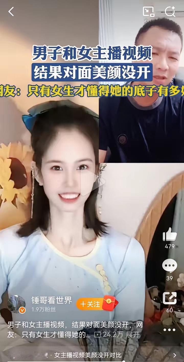 这榜一大哥绝对是真爱!女主播和榜一大哥视频连麦,结果却忘记了开美颜,不小心露出了真实面貌,结果榜一大哥不但没有跑,还耐心提醒说,“诶,你的美颜没开耶!”,女主播听到以后赶快就开启了美颜,然后就马上变回了女神模样,对着榜一大哥微笑! 网友评论: 我实在理解不了那些送钱给主播的,摸不到碰不到,看到的还是假的,图啥呢。 强大的内心才能做好榜一大哥,因为无法知道是真仙女,还是妖怪变身。 没开美颜60岁。开了美颜20岁。开了美颜当闺女养,没开美颜当妈养。 强烈建议关闭美颜功能,一些不良之人利用美颜卖色相骗钱! 直播美颜就是欺骗客户,国家不管,接下来会有ai变声,变人脸,明天家人给你视频说手机丢了,要干嘛干嘛,大家都得小心一点。 很多大哥为了美颜的老女人也是拼了,不惜一郑千金,想问一下榜一大哥的钱从何而来?