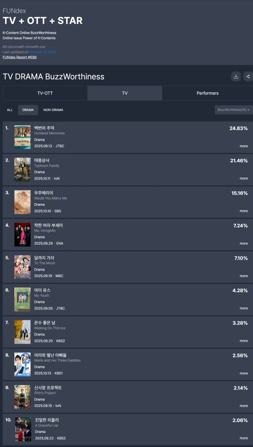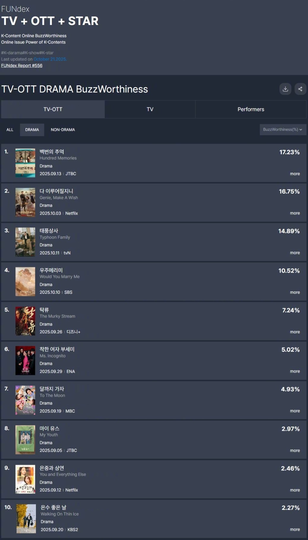 GOODDATA公布2025年10月第3周TV-OTT热度话题性排行。1.韩剧百