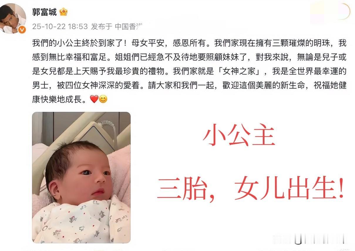 谁能想到! 香港媒体猜了大半个月的 “郭富城三胎是儿子”,今天直接开奖反转成小公主! 方媛顺利卸货母女平安,郭富城发喜报时的开心都要溢出屏幕,这哪是老来得女,分明是又多了个捧在手心的小棉袄! 之前全网都跟着媒体猜性别,连“天王儿子名字会怎么取”的话题都飘过热搜,结果人家直接用“小棉袄”打破所有猜测,不得不说这孩子也太会选,一出生就凑齐“爸爸+妈妈+姐姐”的幸福局。 更有意思的是,算上这次,香港四大天王刘德华、张学友、黎明、郭富城,居然全是“岳父命”,这难道是什么娱乐圈隐藏定律? 不过话说回来,方媛连生三胎都顺顺利利,现在凑齐两个女儿,会不会就此停下脚步?毕竟天王年纪摆在这,再拼四胎对妈妈和孩子都有压力。但也有人说,豪门总想要个儿子兜底,说不定后续还会有动静? 你们觉得郭富城一家会就此“封肚”,还是会继续拼个儿子?评论区聊聊你的看法!方媛