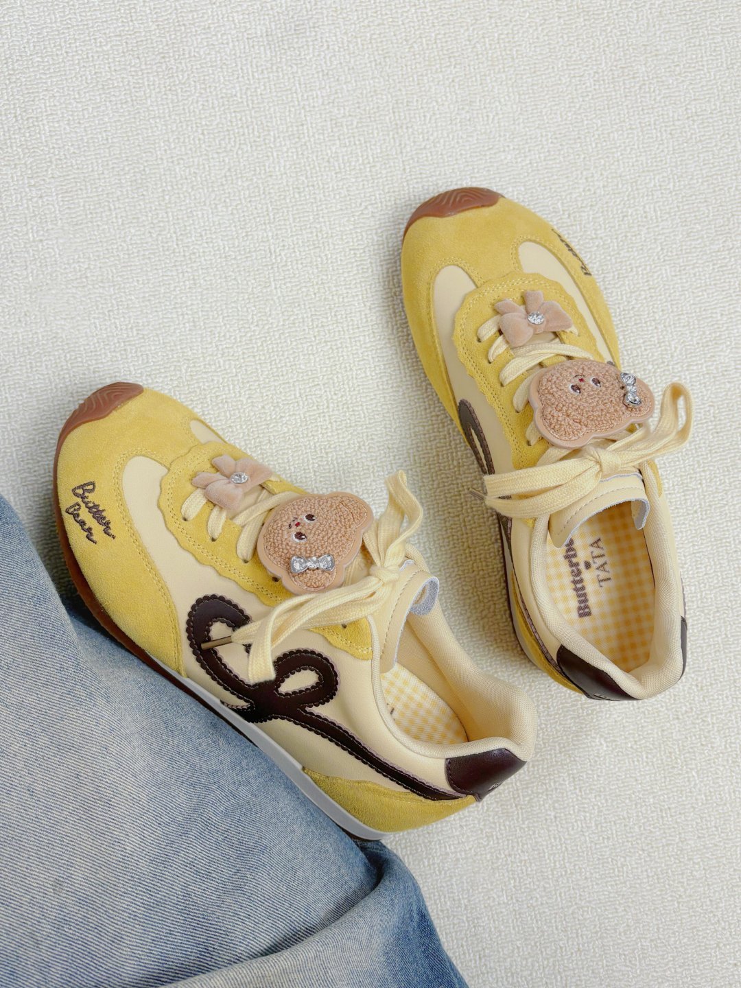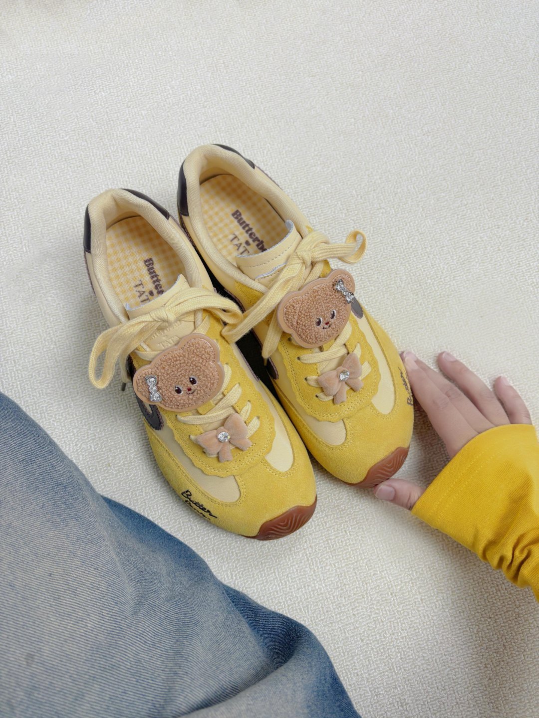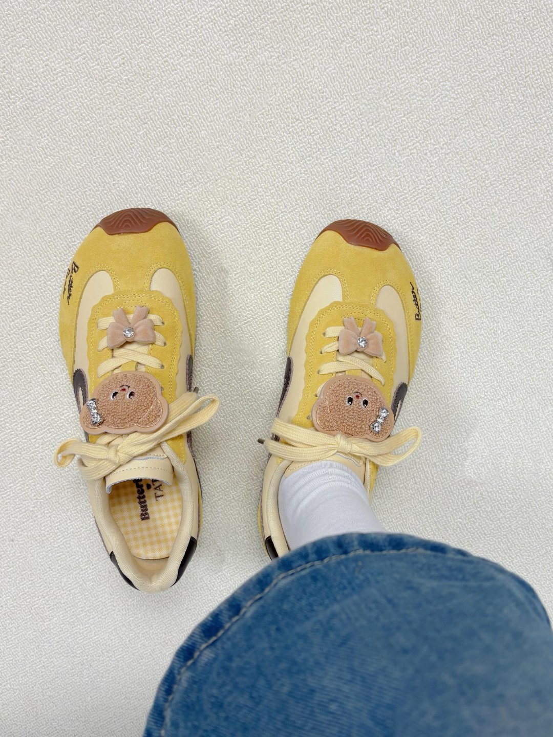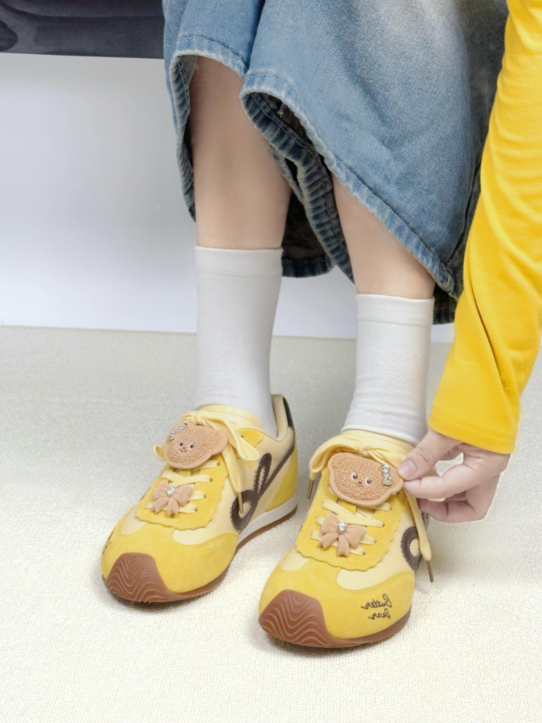 这奶黄色也太清新了,一眼就戳中初秋的氛围感。鞋舌的黄油小熊刺绣软萌到心巴,鞋面上的毛绒小熊+带钻蝴蝶结,细节全是可爱buff。麂皮鞋身摸起来软乎乎的,上脚轻得像没穿,走路一整天都不闷脚还舒服。