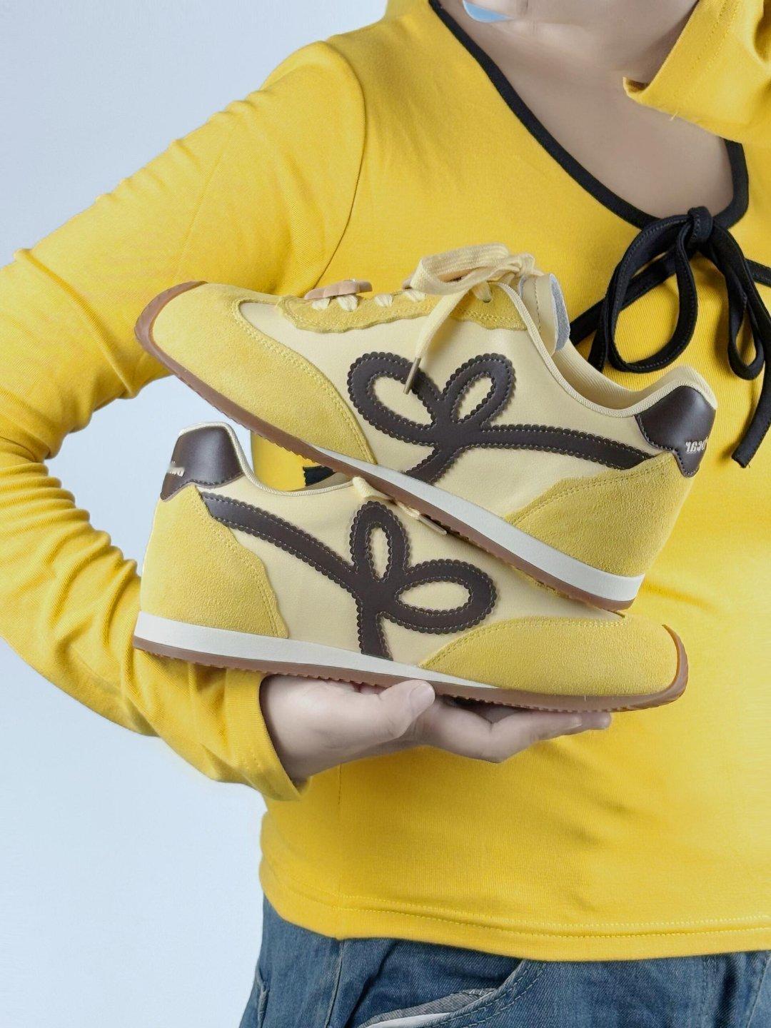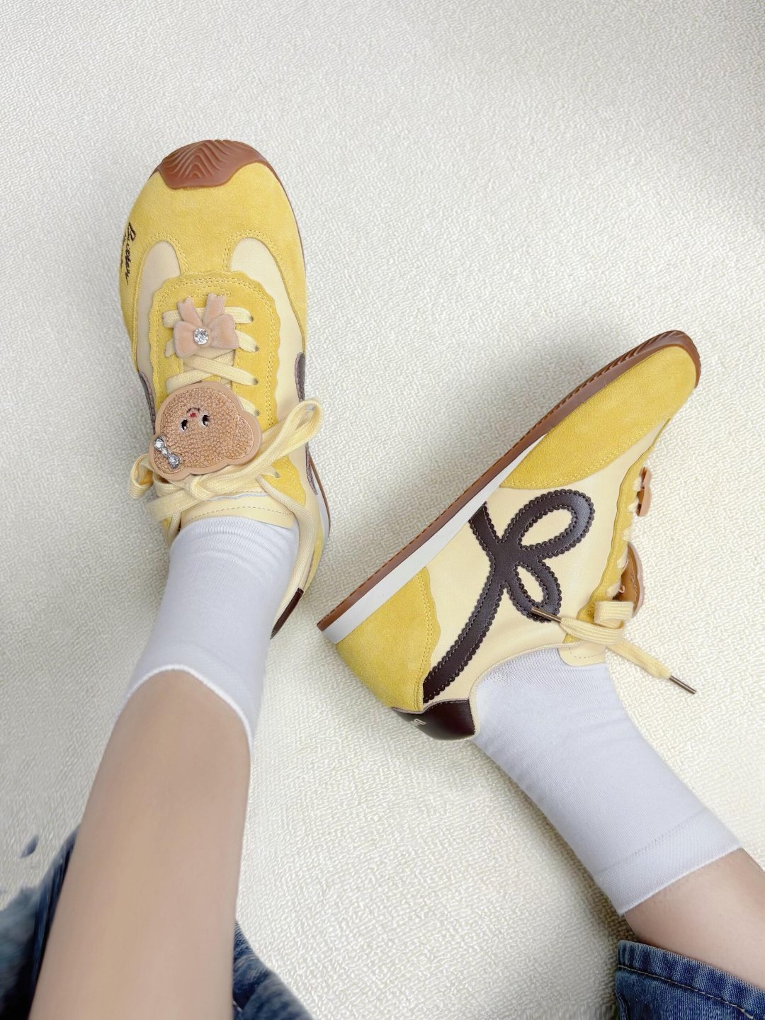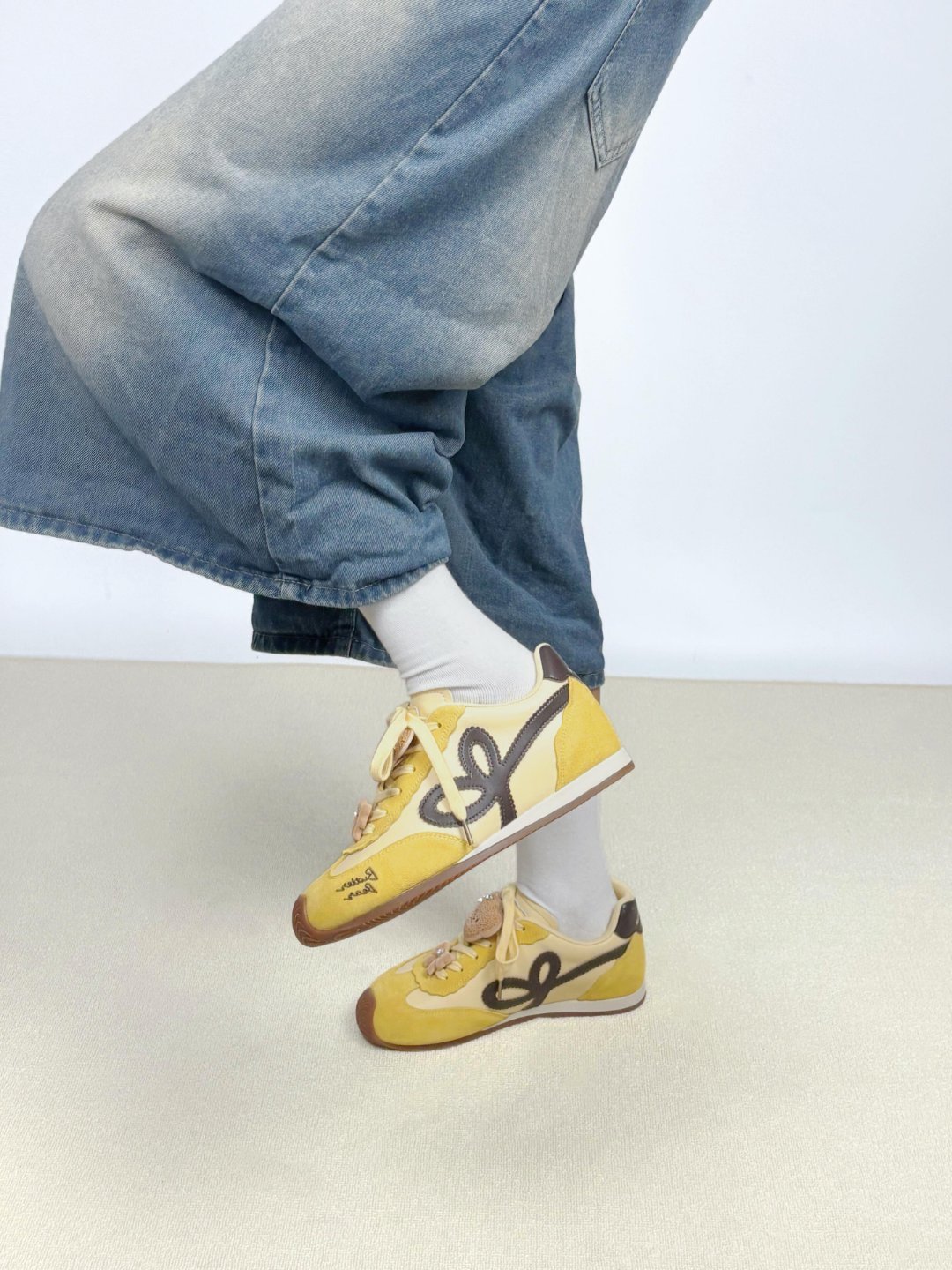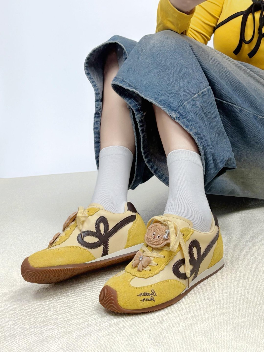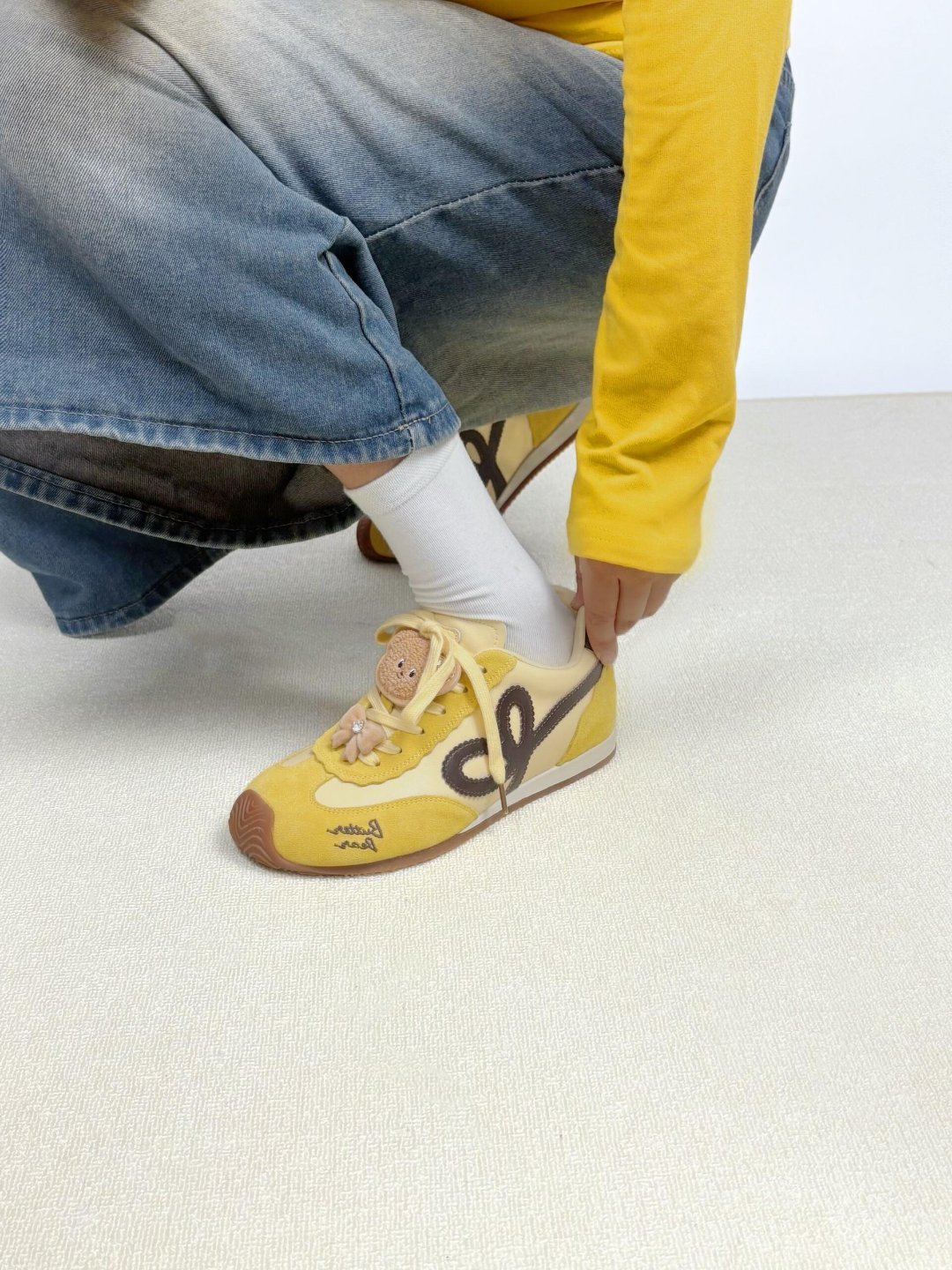 这奶黄色也太清新了,一眼就戳中初秋的氛围感。鞋舌的黄油小熊刺绣软萌到心巴,鞋面上的毛绒小熊+带钻蝴蝶结,细节全是可爱buff。麂皮鞋身摸起来软乎乎的,上脚轻得像没穿,走路一整天都不闷脚还舒服。