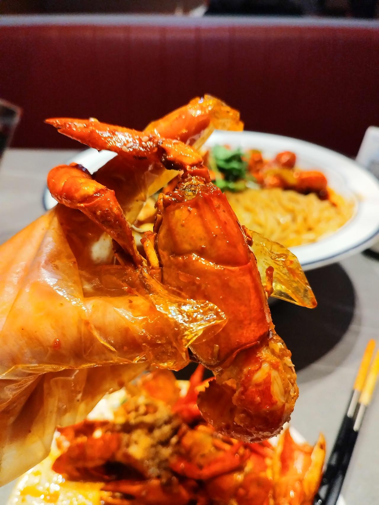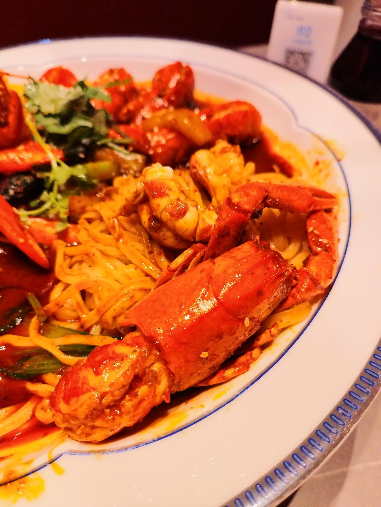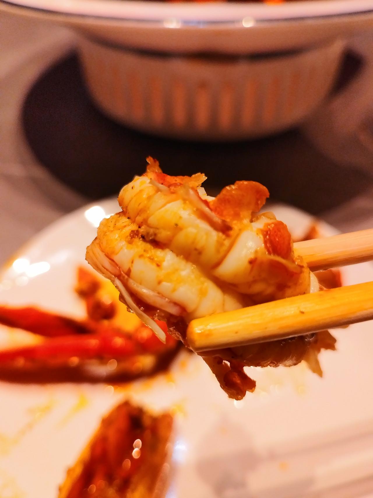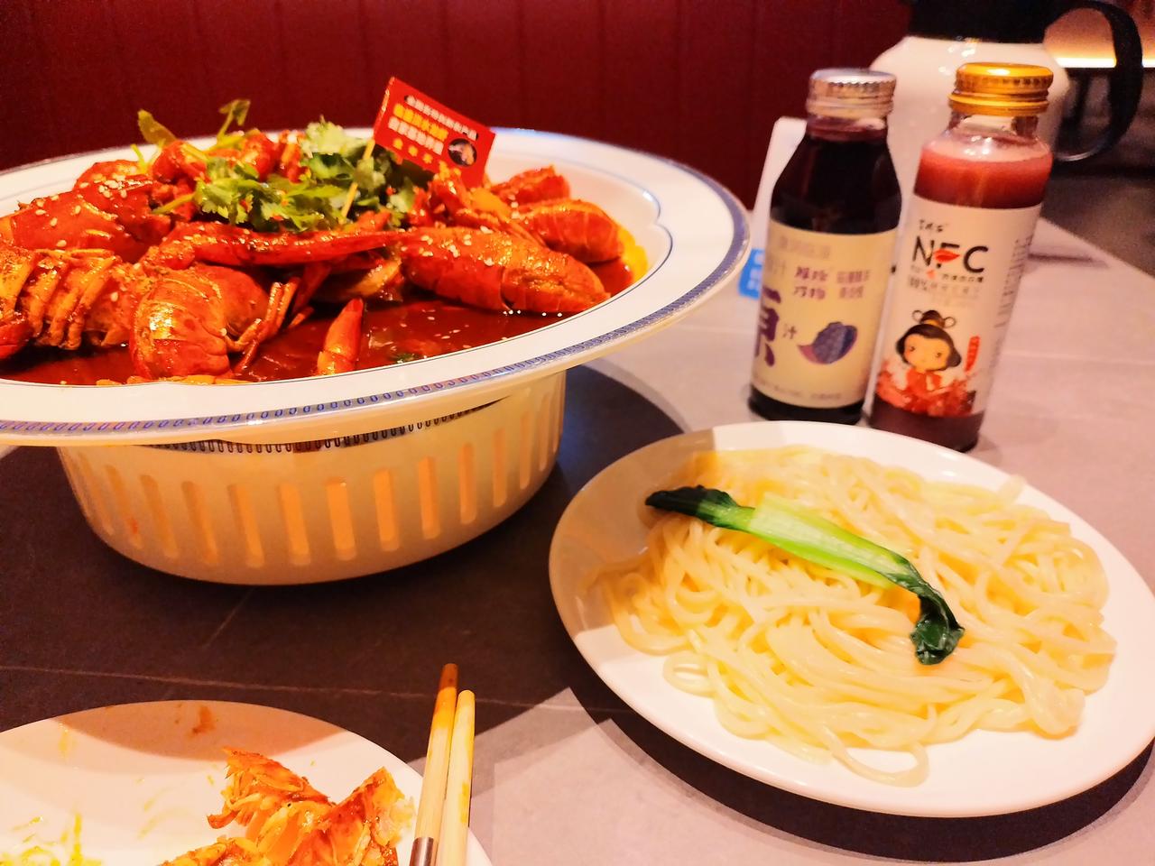 分享一下你随手拍的照片昨天去大唐不夜城吃虾随手拍的,这家店用的蓝龙虾是小龙虾的一种,一只虾有手掌那么大,看店里播放的宣传片,虾的品种自澳洲引进,采用池塘里套大棚的独特方法,在临潼养殖的,养殖场还上央视农业频道了,这家店是今年八月份才开的,装修的非常漂亮,位置就在八号线大唐不夜城B口出来不到两百米的地方,龙虾有五种口味,我要的香辣的,又辣又香,去头开背的蓝龙虾,虾肉紧实Q弹,非常新鲜,套餐还送了一盘细细的拉条子,吃完龙虾往汤汁里一拌,比龙虾肉更入味,饮品是临潼产的石榴汁和桑椹汁,直接把当地的产业链延伸到不夜城,不过价格也是可以的,一盘虾十二只,298,楼上有包间,店里特别干净,用餐体验太好了。