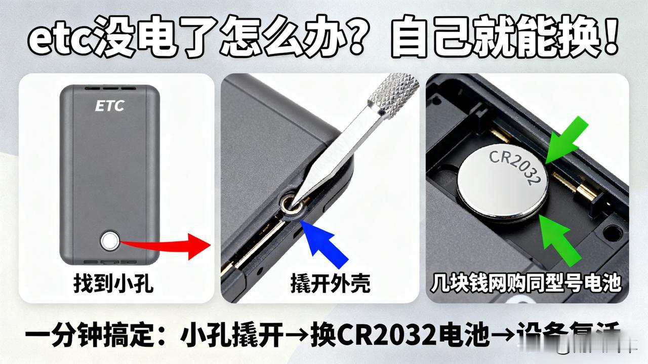 etc没电了怎么办?自己就能换! 显示“电量低”别慌,大部分etc设备后面有个小孔,用撬棒撬开就能看到电池。 网上花几块钱买块同型号的CR2032电池,自己换上立马“复活”,省下跑网点的功夫。 ETC Etc 私家车etc ETC流程 ETc 车载etc ETC新标准