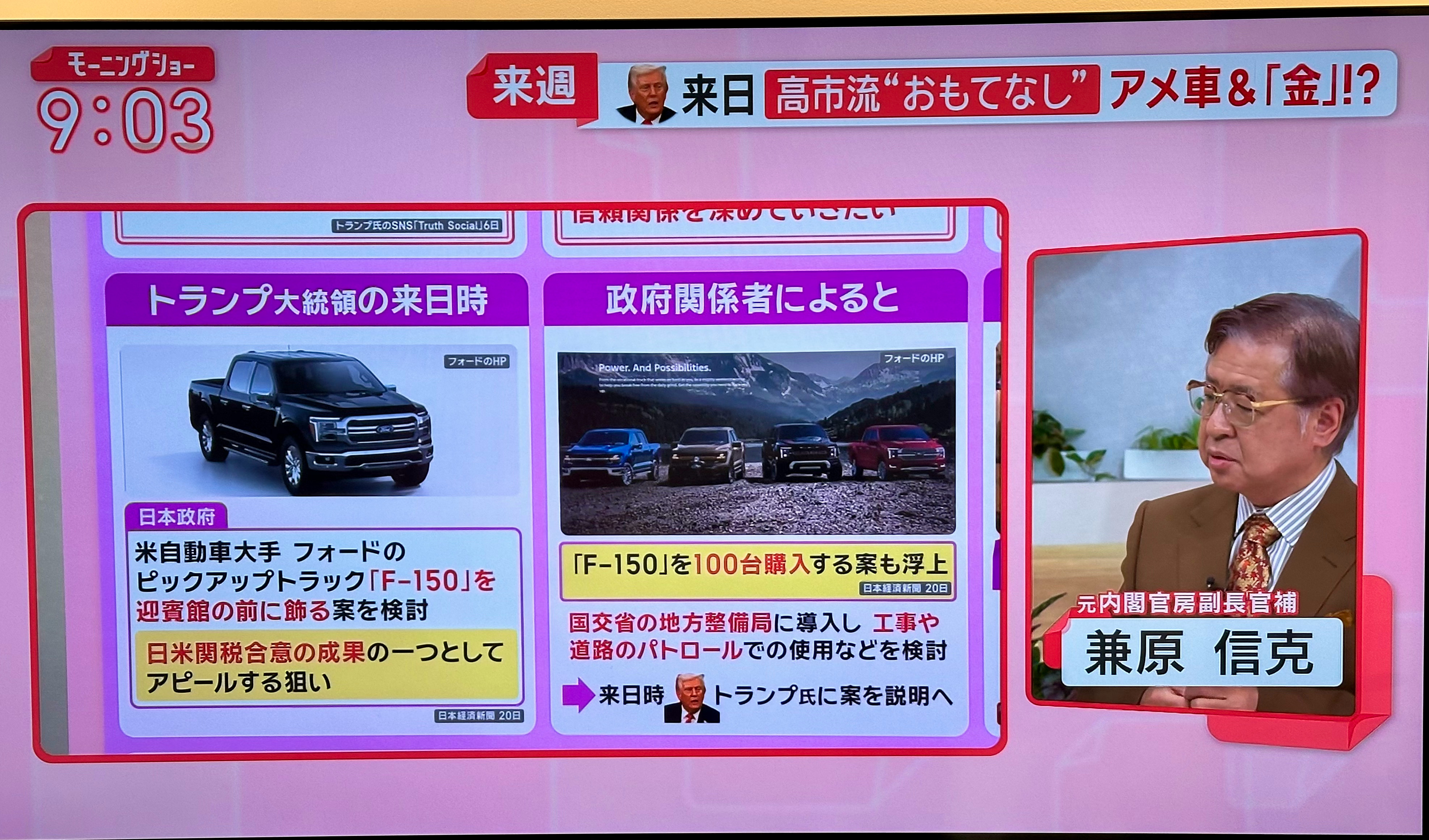 高市早苗准备带采购清单见特朗普 日本电视台今天报道,为了迎接特朗普访日,日本政府准备了一份“大礼”:在东京赤坂迎宾馆门前摆福特F150皮卡,还考虑采购100辆做道路巡逻车。想象一下那场面:一排F150猛禽大皮卡的镀铬车头在阳光下闪闪发光,绝对比买大豆、天然气更投特朗普所好,比任何外交辞令都直接[笑cry]