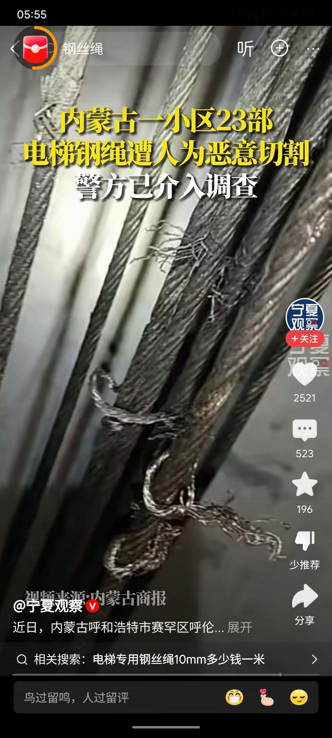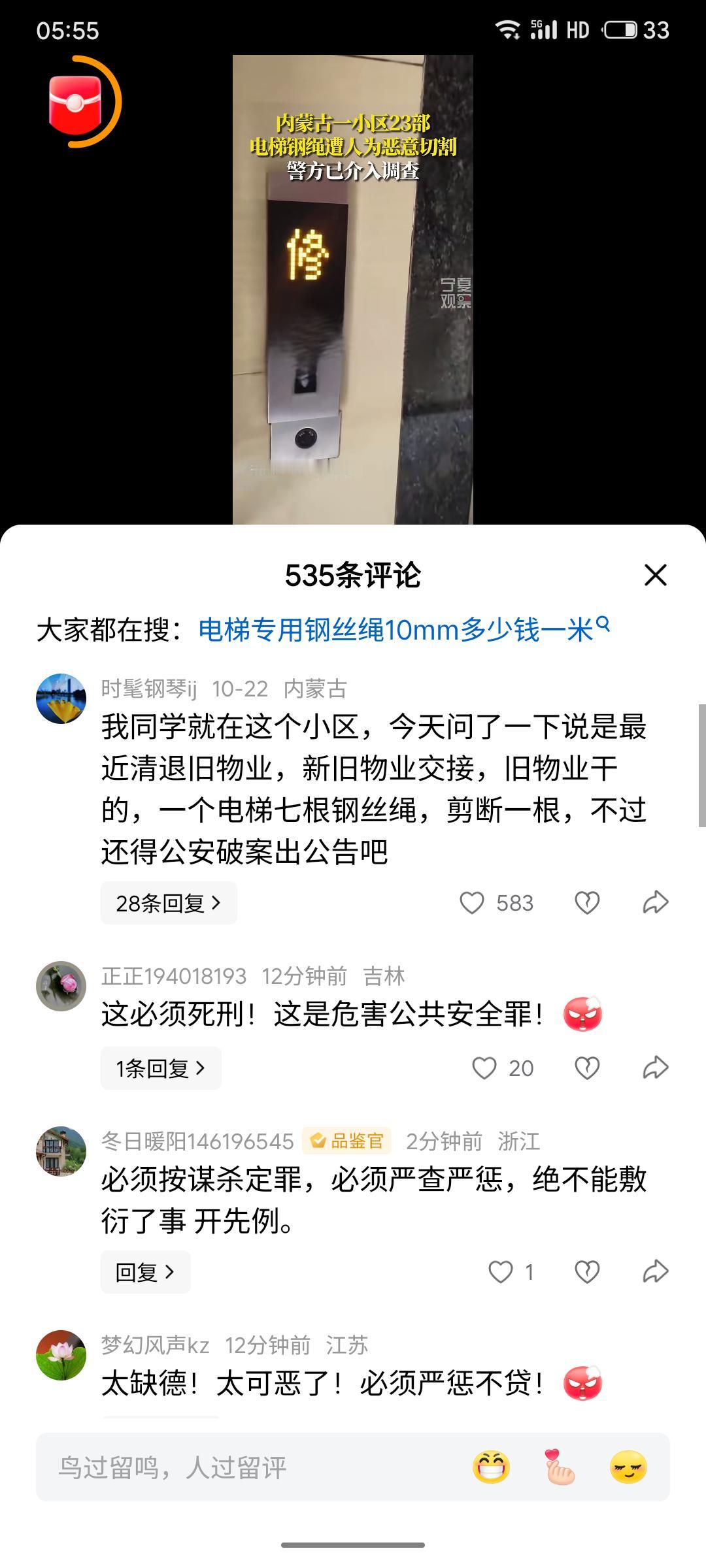 近日,内蒙古呼和浩特市某小区23部电梯的钢丝绳遭人为恶意切割,警方已介入调查。网友猜测或与新旧物业交接纠纷有关,纷纷谴责该行为危害公共安全,呼吁严惩肇事者。事件原因待官方进一步通报。
