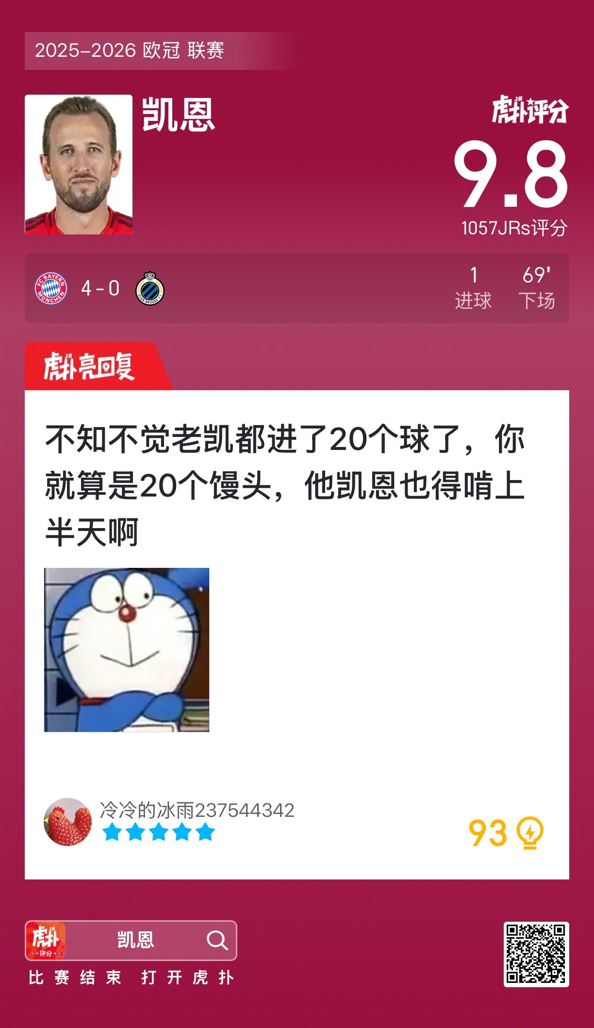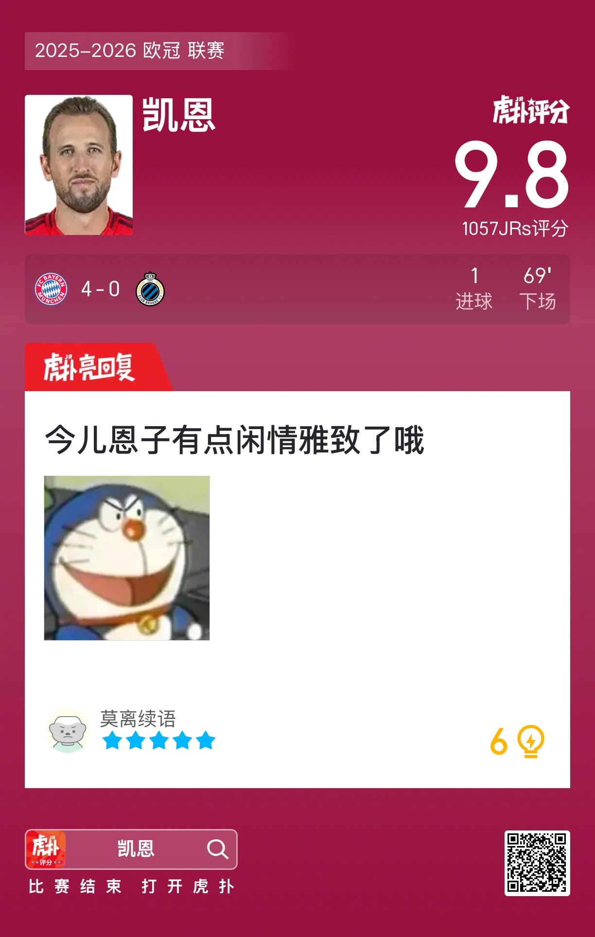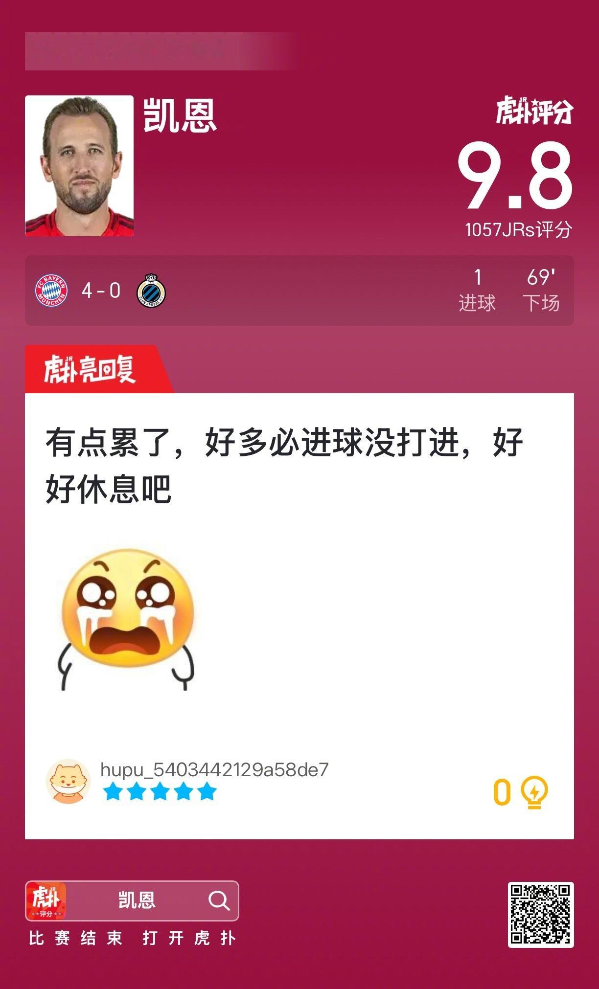 拜仁4比0布鲁日凯恩打进一球,赛后收获9.8的虎扑评分!