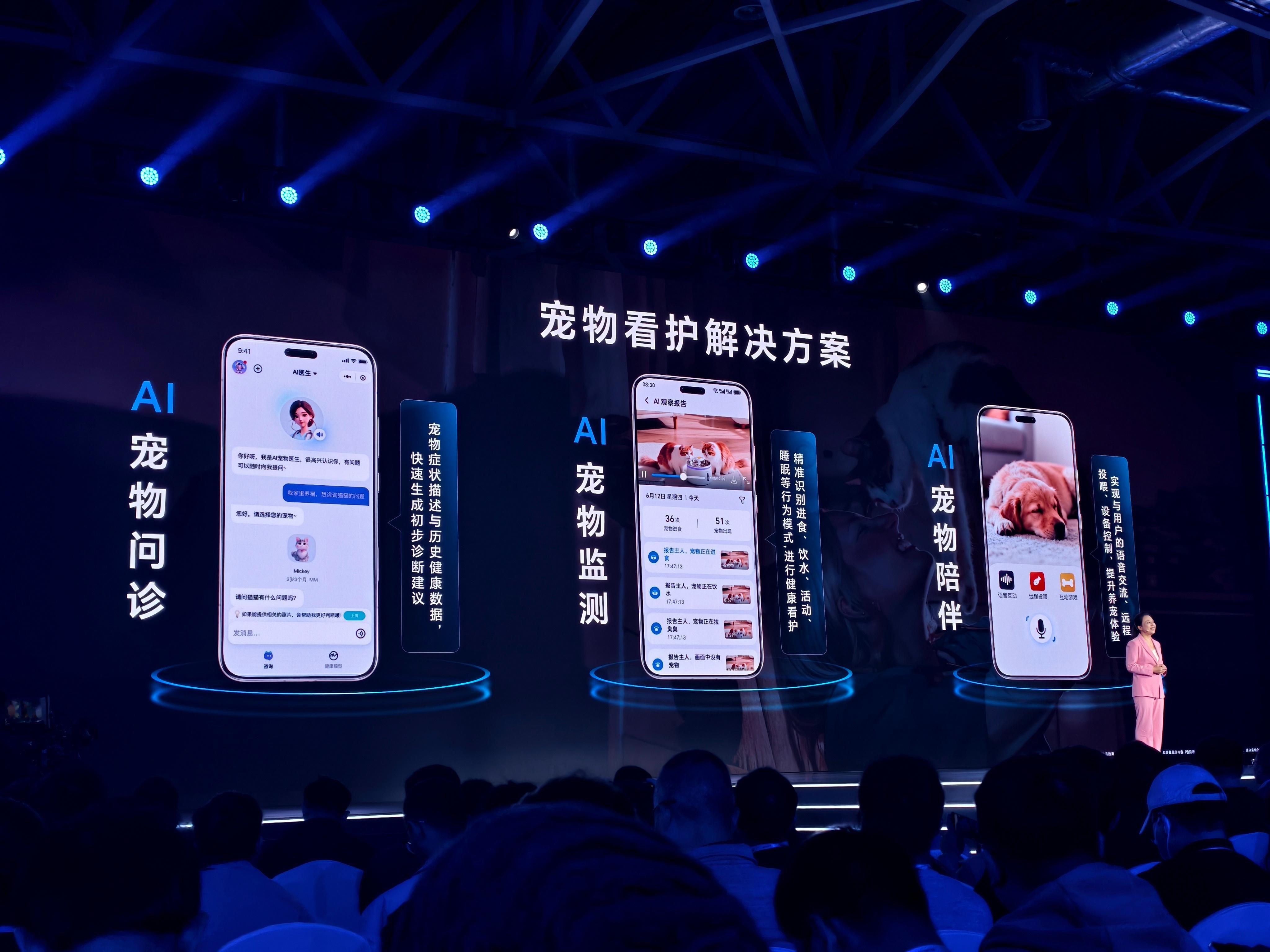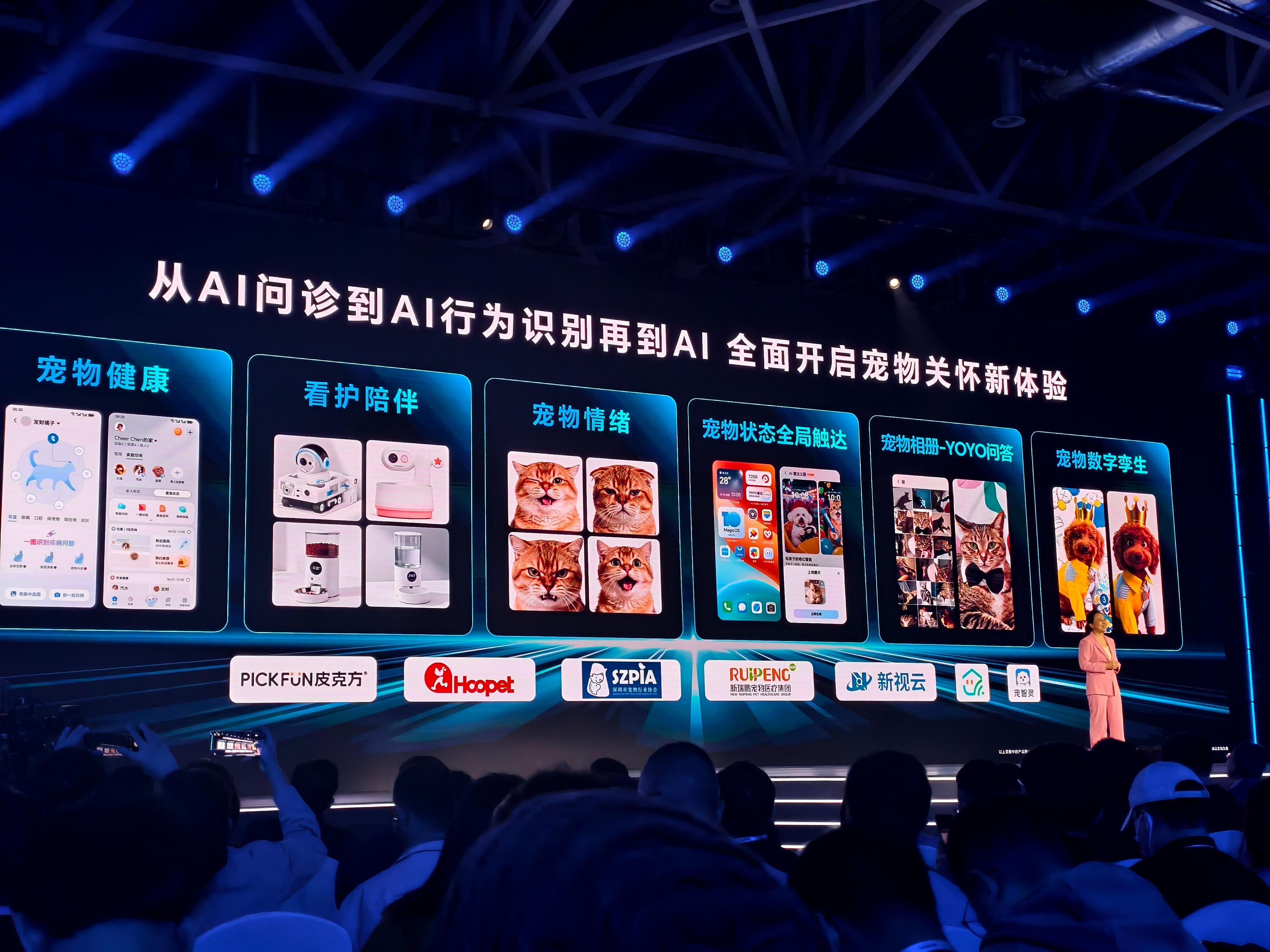 荣耀全球开发者大会2025 荣耀针对宠物看护,提供AI宠物问诊,宠物监测,宠物陪伴等,其中宠物问诊相当于手机里面集成了一个有AI大模型加持的宠物医生,可以通过问答形式、上传照片,获得一个基础的宠物诊断。