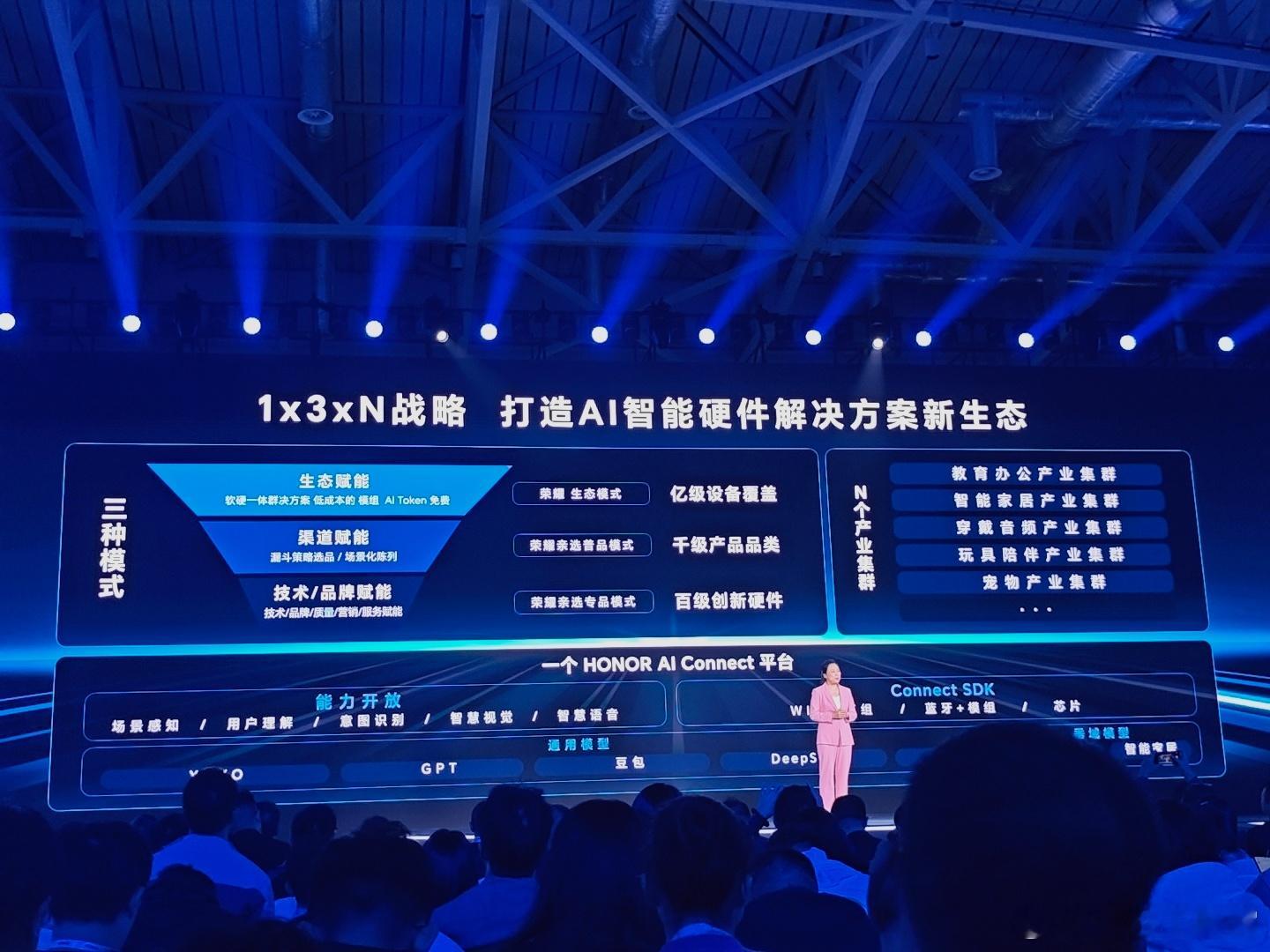今早来参加荣耀AI终端生态大会,荣耀产品线总裁方飞宣布,荣耀将推出1x3xN战略,一个平台 + 三项赋能 + N个产品集群,通过HONOR AI Connect平台把荣耀的AI能力开放给生态伙伴,通过生态赋能、渠道赋能和技术品牌赋能,三种不同的模式去扶持合作伙伴,能感受到荣耀接下来会大力发展AI,可以期待下[喵喵]