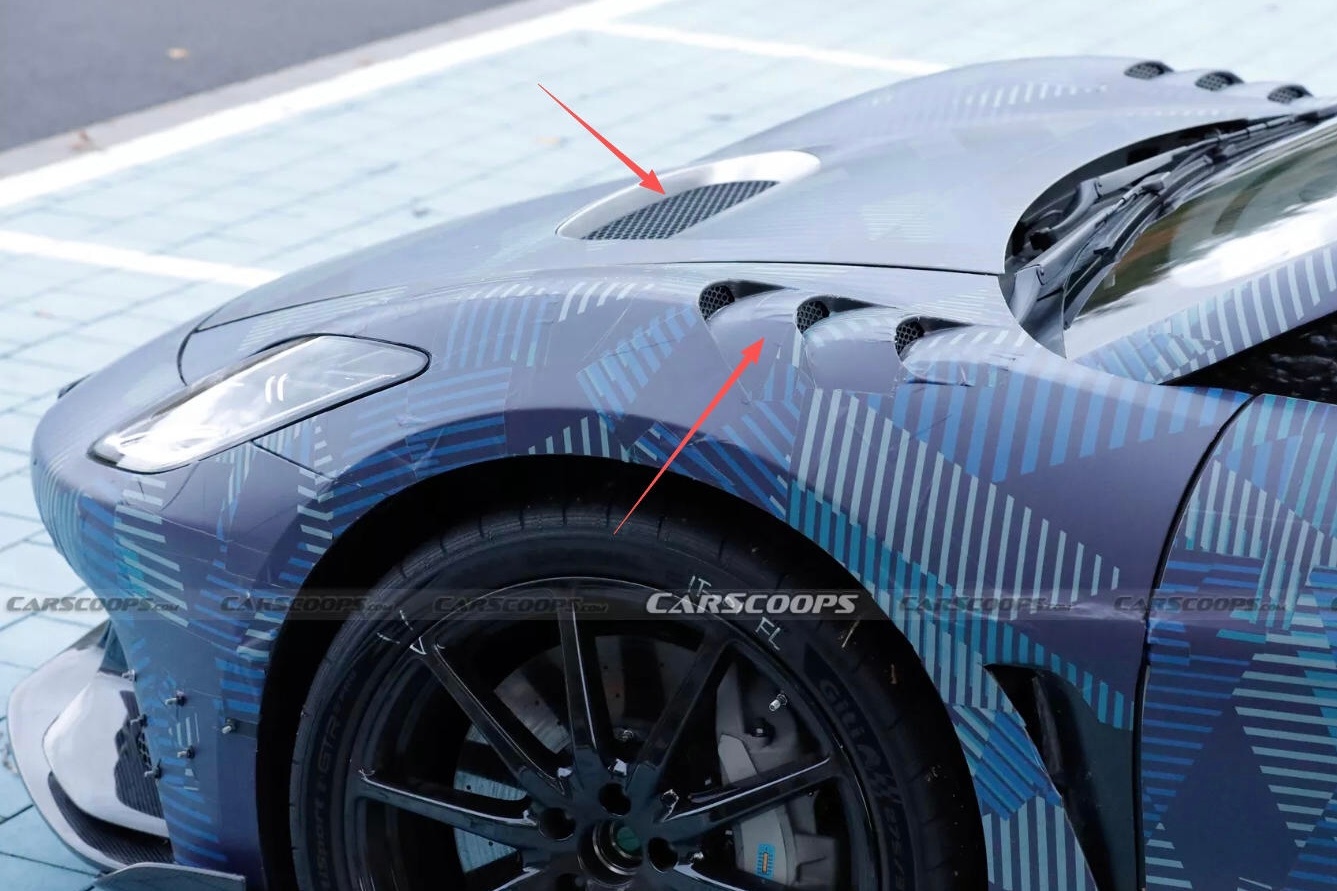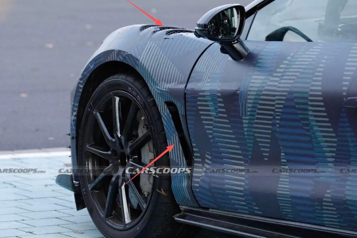 1️⃣首先车头部分有一个大尺寸的分流器,两侧有控制前轮气流的导流叶片,前轮拱上方和后面都有开口,释放压力,增加前轴的下压力,前舱盖有通风口,这是一个真正的S-Duct
