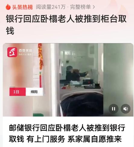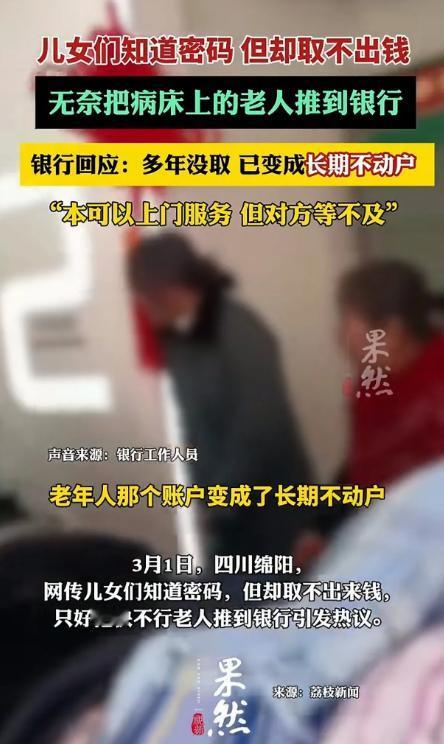 四川绵阳,一老人病的奄奄一息,儿女知道老人银行卡密码,去银行却取不出钱。银行说老人的卡多年没取钱,已经变成长期不动户,无奈,儿女们把快不行的老人推到银行才把钱取出,这件事引发热议。银行回应:我们这样做是为了确保资金安全,本可以上门服务的,但对方等不及。 当一位奄奄一息的老人生病急需用钱,子女握着银行卡和密码赶到银行,却被告知因账户长期未使用,已被锁定为“不动户”。银行柜员只是一味地重复着“必须本人来取”,仿佛所谓的“规定”比老人家的生死更重要。 最终,子女们不得不把生命垂危的老人用轮椅推到银行,在众目睽睽之下完成这场荒唐的“身份验证”。当老人颤抖的手在单据上按下手印时,每一个动作都在拷问着:我们的服务体系究竟为何而存在? 按照涉事银行的说法,卡取不出钱不是故意刁难,而是金融监管的要求。那些长期没交易的账户,容易成为诈骗分子的目标,本人验证是为了防冒领。 如果单从资金安全角度来说,银行的操作没毛病。但问题恰恰出在“特殊情况特殊处理”的环节上。 对于重病老人无法到场的情况,银行说能提供上门服务,可必须等到周一监管审批后才可以。偏巧事发在周末,家属急着用钱治病,根本等不起。 这番说辞听起来冠冕堂皇,却暴露了服务行业最致命的虚伪。把预案当借口,用流程推卸责任,却丝毫没有考虑到实际情况与应变方案。 往深处想,银行所谓的“流程限制”真的不可破吗?周末不能审批、无法安排上门,本质上是应急机制的缺失。金融诈骗需要防,但病危老人的紧急需求更该被看见不是吗? 这起事件中最讽刺的地方在于,银行反复强调“预防风险”,可如果为了预防风险,反而把储户逼到绝境,未免也太本末倒置了。 于是,有网友嘲讽:“骗子都能想尽办法、千方百计的钻漏洞骗钱,而银行的服务却卡在了‘周一才能办’的流程里。” 更值得警惕的是,这类“抬老人到银行”的事件并非个例。每次事发都能引起热议,但热度过后问题依旧。根源就在于,很多银行的“人性化服务”只停留在文件里,没有真正落地成应急方案。 最终,家属虽然取到了钱,但老人遭的罪、一家人的焦虑,本不该发生。银行辩称“是家属主动要求推老人过来的”,可这句话根本掩盖不了服务衔接的漏洞。 资金安全要守,但服务的温度更不能丢,毕竟银行的规则是为了守护人,而不是把人挡在门外。对此你有什么看法?欢迎在评论区留言讨论。 银行 资金安全 信息来源: 齐鲁壹点2025-3-2|银行回应快不行老人被推到银行取钱:多年没取那笔钱 已变成长期不动户 文|墨海 编辑|史叔